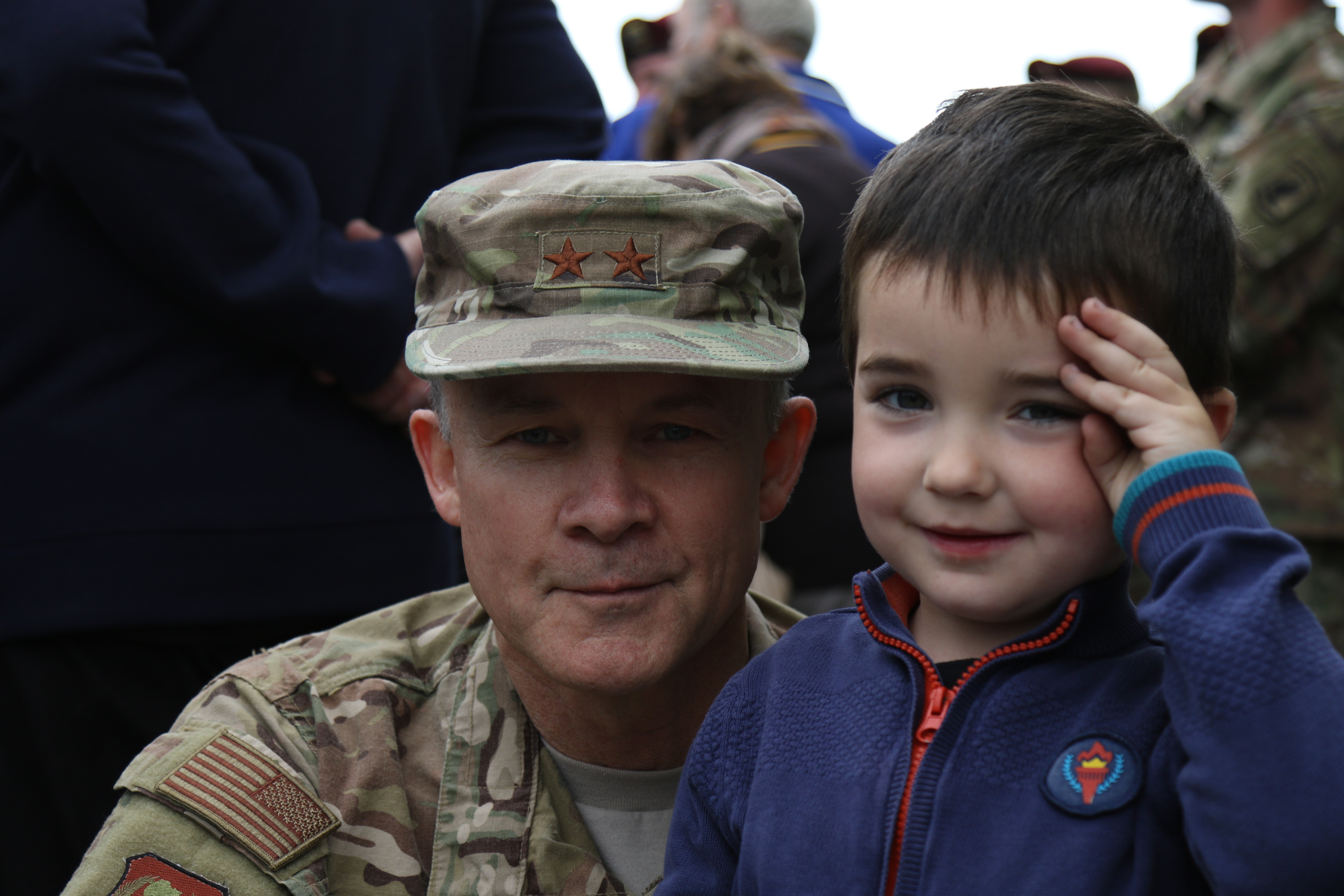 Maj. Gen. John Williams, Mobilization Assistant to the Commander, U.S. Air Forces in Europe; Commander, U.S. Air Forces Africa; Commander, Allied Air Command, takes a photo with a young French boy during a memorial ceremony on June 4, 2019 to honor U.S. contributions to liberate Picauville, France.