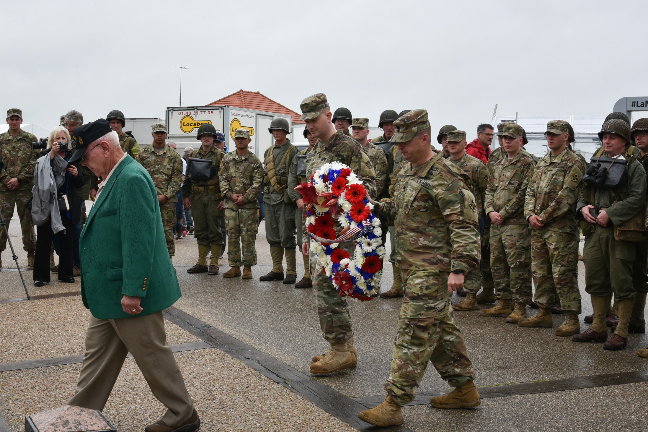U.S. Soldiers assigned to 4th Infantry Division present a wreath to the Monument of the 4th Infantry Division at Utah Beach, Sainte-Marie-du-Mont, Normandy, France, June 4, 2019 as part of commemorations of the 75th anniversary of Operation Overlord, the WWII Allied Invasion of Normandy, commonly known as D-Day.