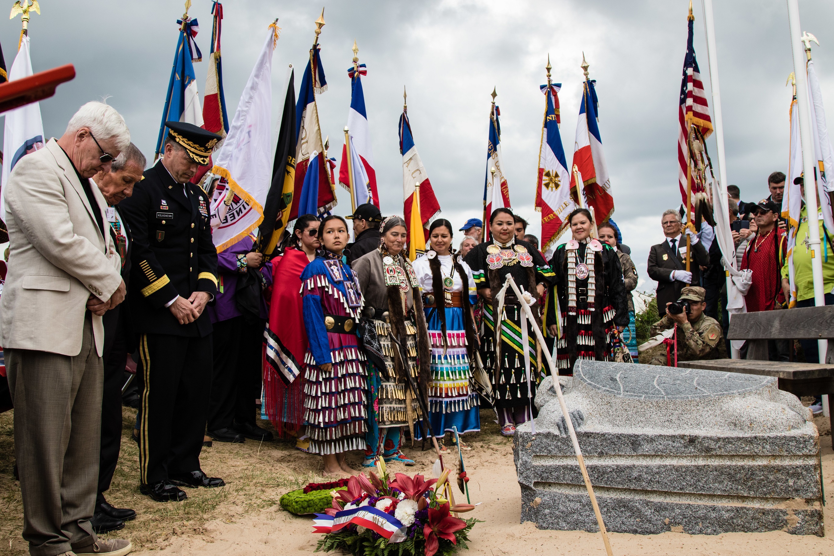 A moment of silence is taken for all the fallen Native American WWII veterans at the Charles Shay memorial ceremony at Omaha Beach, France, June 5, 2019, part of commemorations honoring the 75th anniversary of Operation Overlord, the WWII Allied Invasion of Normandy, commonly known as D-day