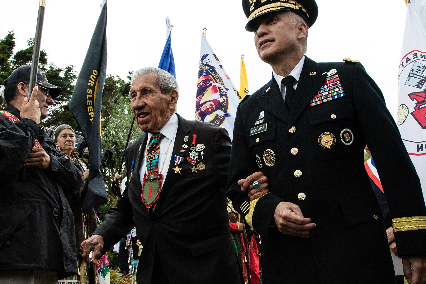 General Paul M. Nakasone, commander of U. S. Cyber Command, escorts WWII veteran Charles Shay to the Charles Shay memorial ceremony at Omaha Beach, France June 5, 2019, part of commemorations honoring the 75th anniversary of Operation Overlord, the WWII Allied Invasion of Normandy, commonly known as D-day.