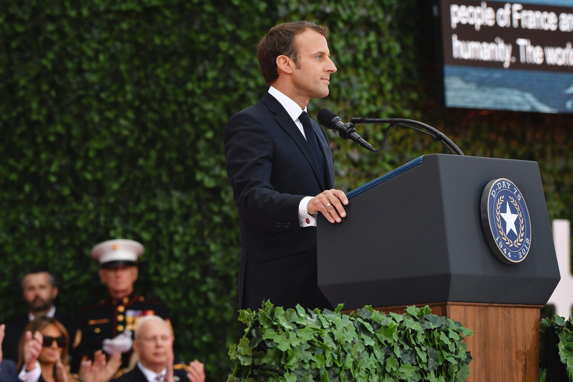 President Emmanuel Macron, the President of France, speaks at the 75th D-Day Anniversary ceremony at Normandy American Cemetery and Memorial in Colleville-sur-Mer, France, June 6, 2019.