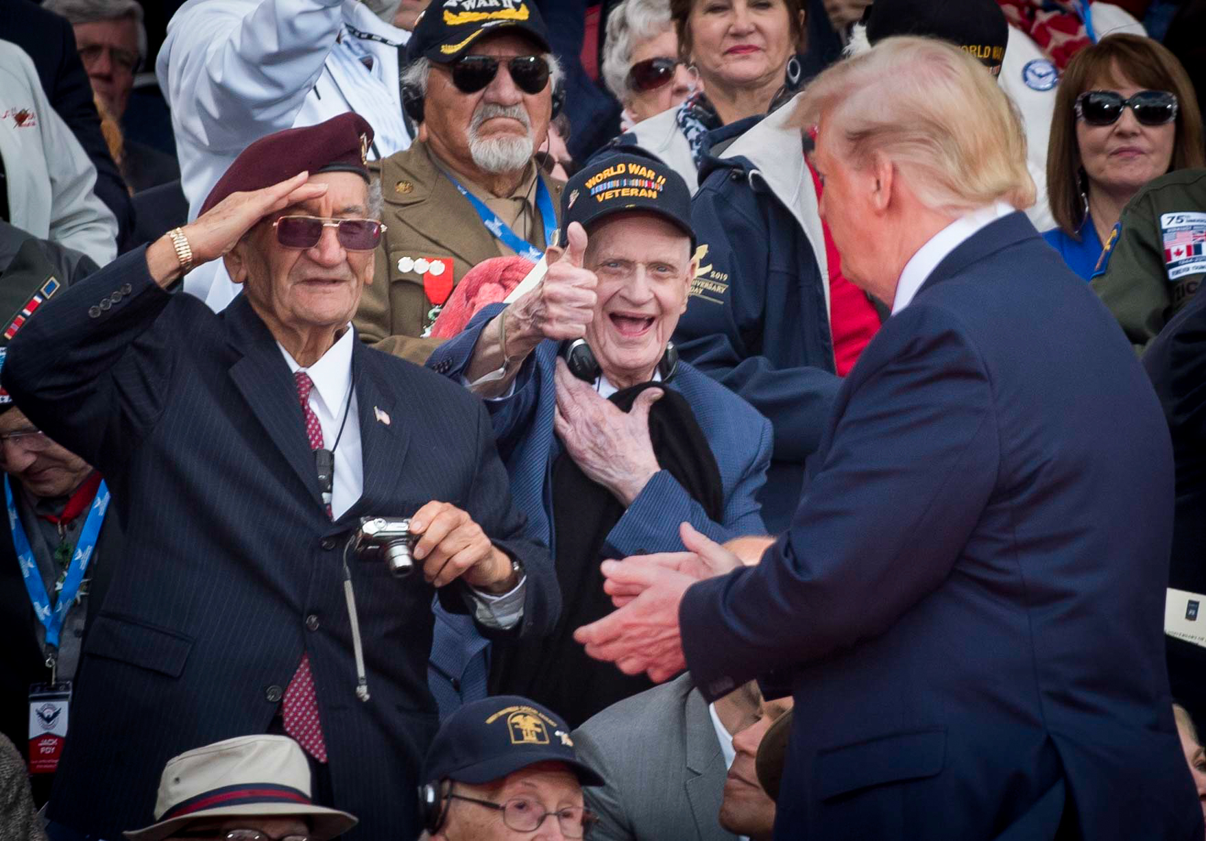 190606-N-YG104-0014 NORMANDY, France (June 06, 2019) President Donald J. Trump applauds D-Day veterans at a ceremony honoring the 75th anniversary of D-Day at the Normandy American Cemetery and Memorial. American and French military members are joining our nation’s leaders to honor those who made the ultimate sacrifice and gave their lives in defense of their nation on that fateful day. (U.S. Navy photo by Mass Communication Specialist 1st Class Sarah Villegas)
