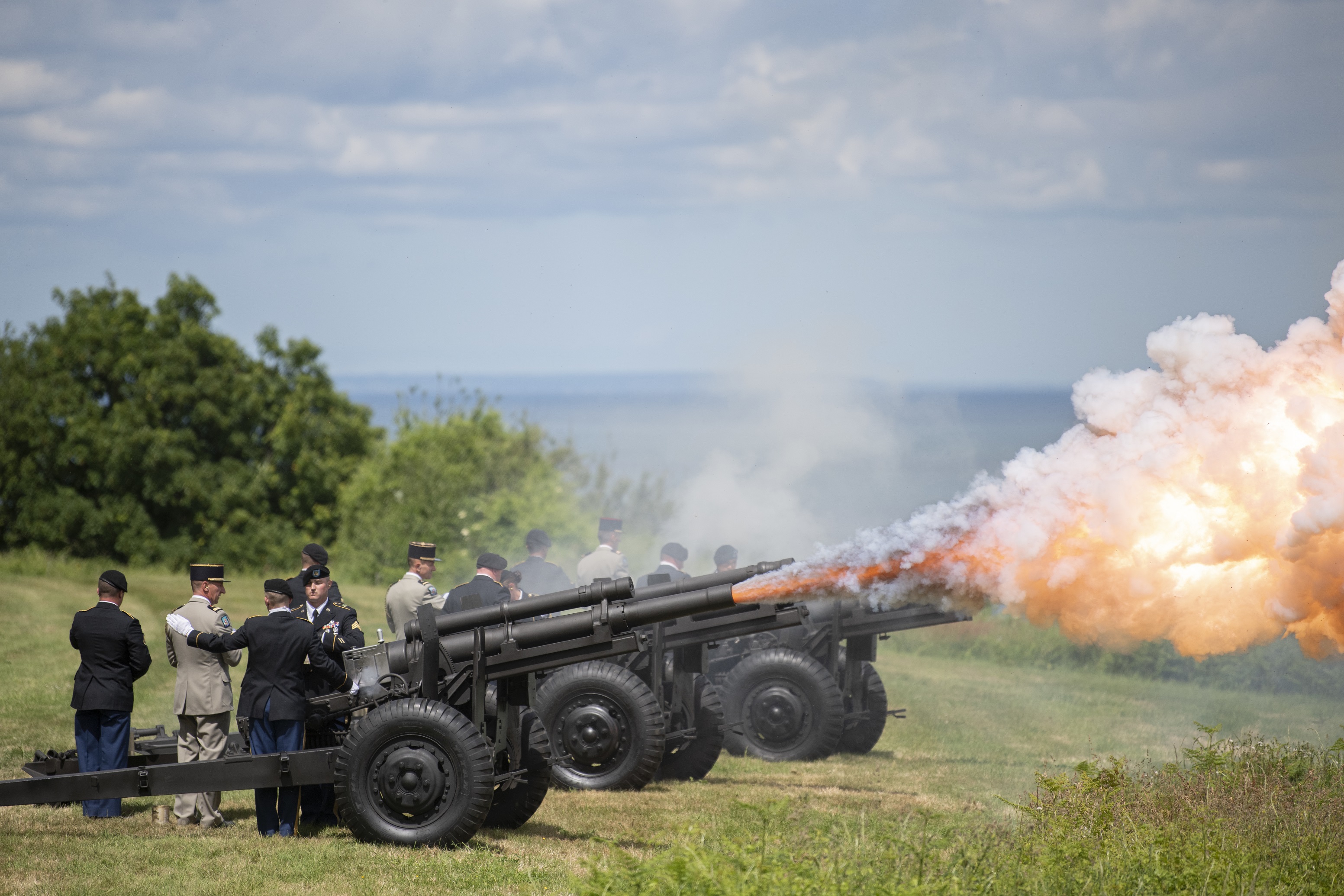 U.S. Army Soldiers assigned to the 529 Military Police Battalion Honor Guard fire a 21 gun salute from their Howitzer canons during the commemoration ceremony of the 75th anniversary of D-Day at the Normandy American Cemetery and Memorial, June 6, 2019. The ceremony is the apex of more than 80 events commemorating the 75th anniversary of D-Day, the largest multi-national amphibious landing and operational military airdrop in history and highlighted the U.S. steadfast commitment to European allies and partners. More than 1,300 U.S. service members, partnered with 950 troops from across Europe and Canada, to converge in northwestern France to take part in the events that began June 1 and will continue until June 9. (U.S. Army photo by Cpl. Kevin Sterling Payne)