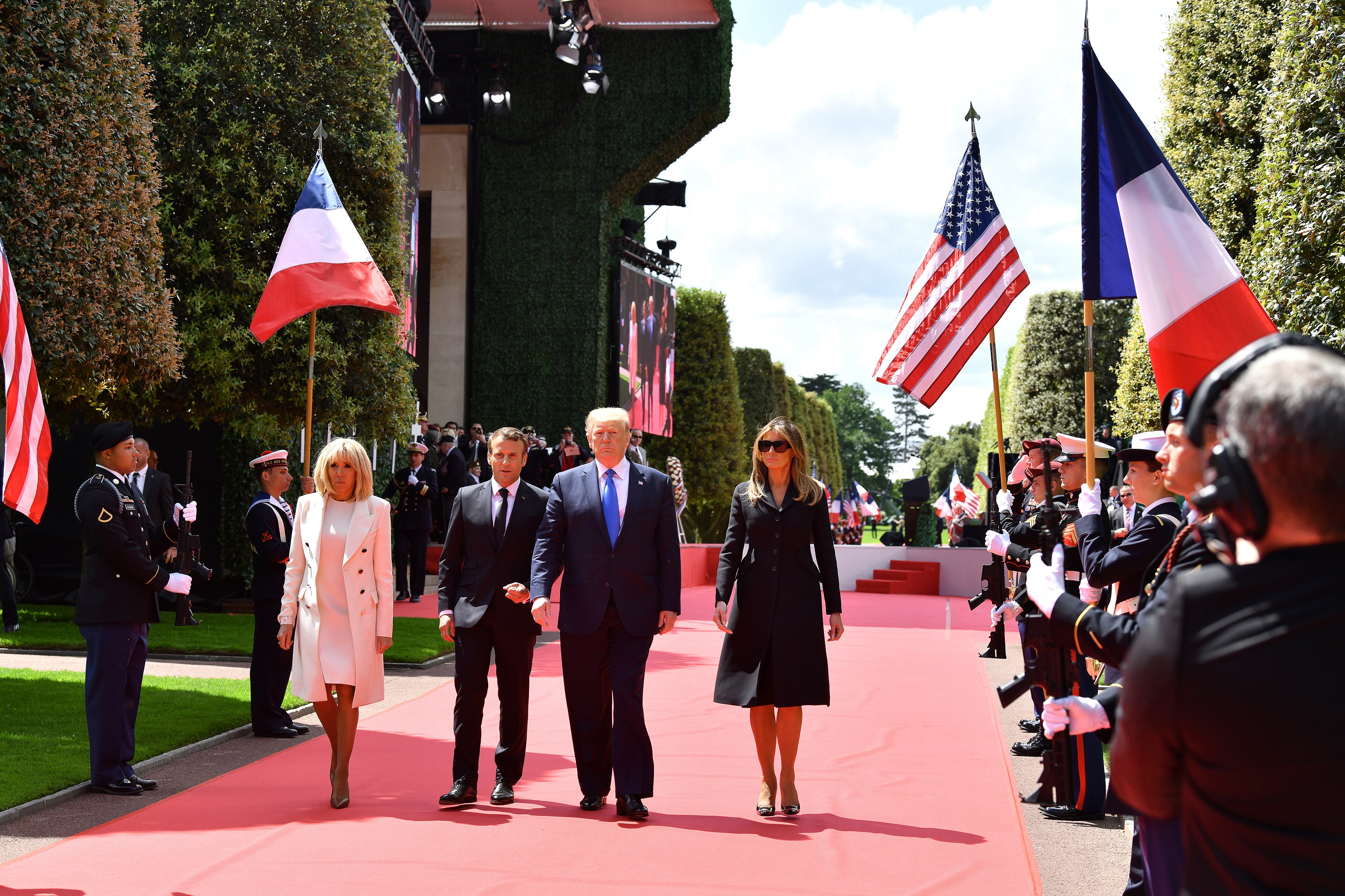 French First Lady Brigitte Macron, French President Emmanuel Macron, U.S. President Donald J. Trump, and First Lady Melania Trump walk through a colors cordon during the commemoration ceremony of the 75th anniversary of D-Day at the Normandy American Cemetery and Memorial, June 6, 2019. The ceremony is the apex of more than 80 events commemorating the 75th anniversary of D-Day, the largest multi-national amphibious landing and operational military airdrop in history and highlighted the U.S. steadfast commitment to European allies and partners. More than 1,300 U.S. service members, partnered with 950 troops from across Europe and Canada, to converge in northwestern France to take part in the events that began June 1 and will continue until June 9. (U.S. Air Force photo by Master Sgt. Andy M. Kin)