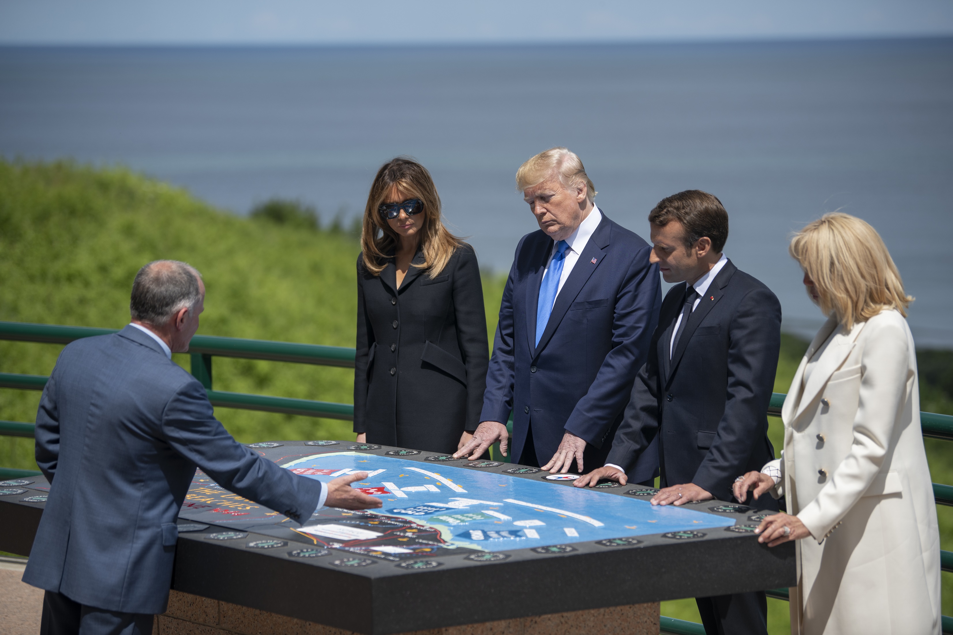 First Lady Melania Trump, U.S. President Donald J. Trump, French President Emmanuel Macron, and French First Lady Brigitte Macron, with a member of the American Battle Monuments Commission study a map of the D-Day landings at an Omaha beach overlook during the commemoration ceremony of the 75th anniversary of D-Day at the Normandy American Cemetery and Memorial, June 6, 2019. The ceremony is the apex of more than 80 events commemorating the 75th anniversary of D-Day, the largest multi-national amphibious landing and operational military airdrop in history and highlighted the U.S. steadfast commitment to European allies and partners. More than 1,300 U.S. service members, partnered with 950 troops from across Europe and Canada, to converge in northwestern France to take part in the events that began June 1 and will continue until June 9. (U.S. Army photo by Cpl. Kevin Sterling Payne)