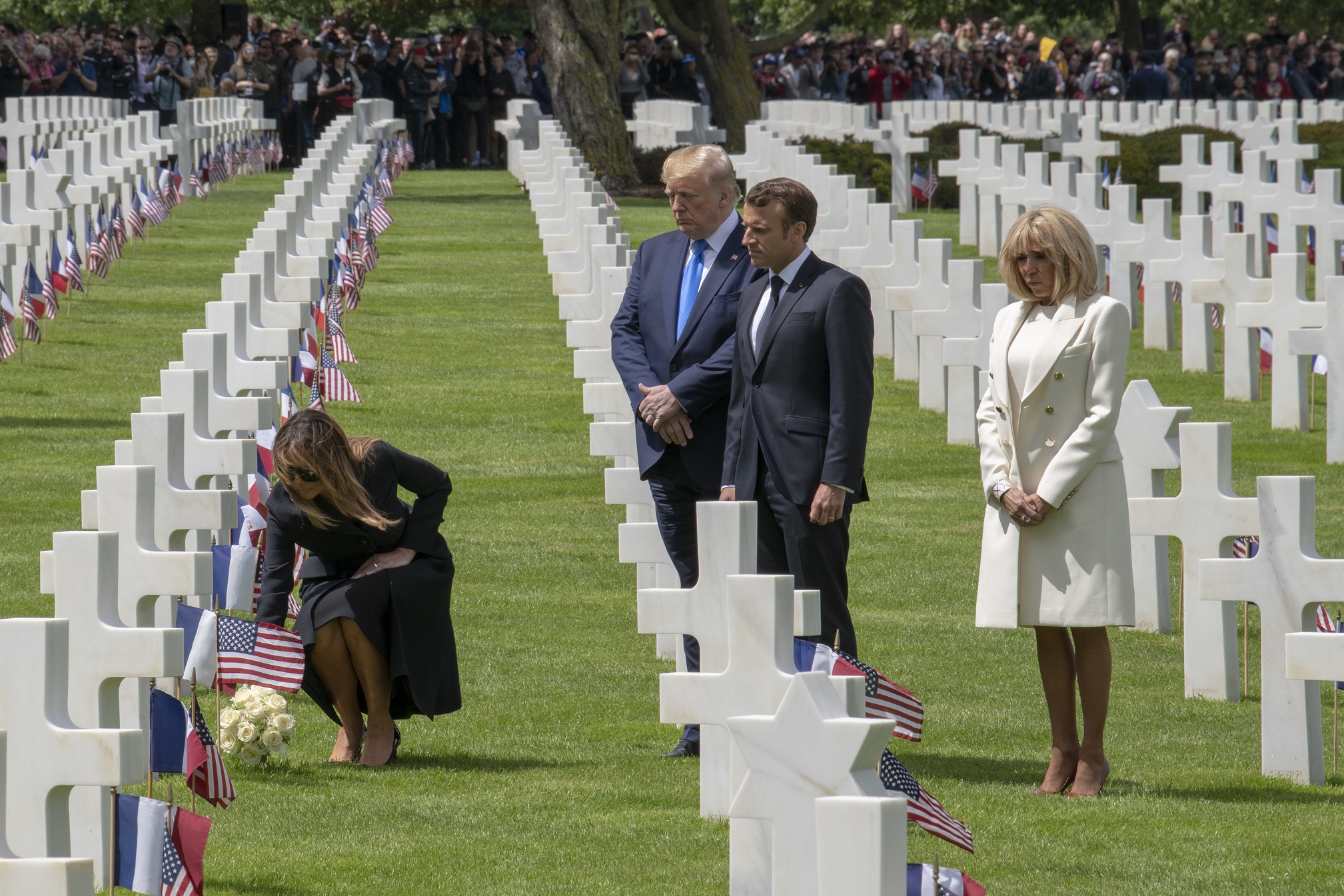 U.S. First Lady Melania Trump places flowers at the grave of an American service member buried at the Normandy American Cemetery, June 6, 2019. The First Lady, U.S. President Donald J. Trump, French President Emmanuel Macron, and French First Lady Brigitte Macron were at the cemetery to take part in a ceremony commemorating the 75th anniversary of D-Day. The ceremony is the apex of more than 80 events commemorating the 75th anniversary of D-Day, the largest multi-national amphibious landing and operational military airdrop in history, and highlighted the U.S. steadfast commitment to European allies and partners. (U.S. Army photo by Sgt. Edward A. Salcedo)