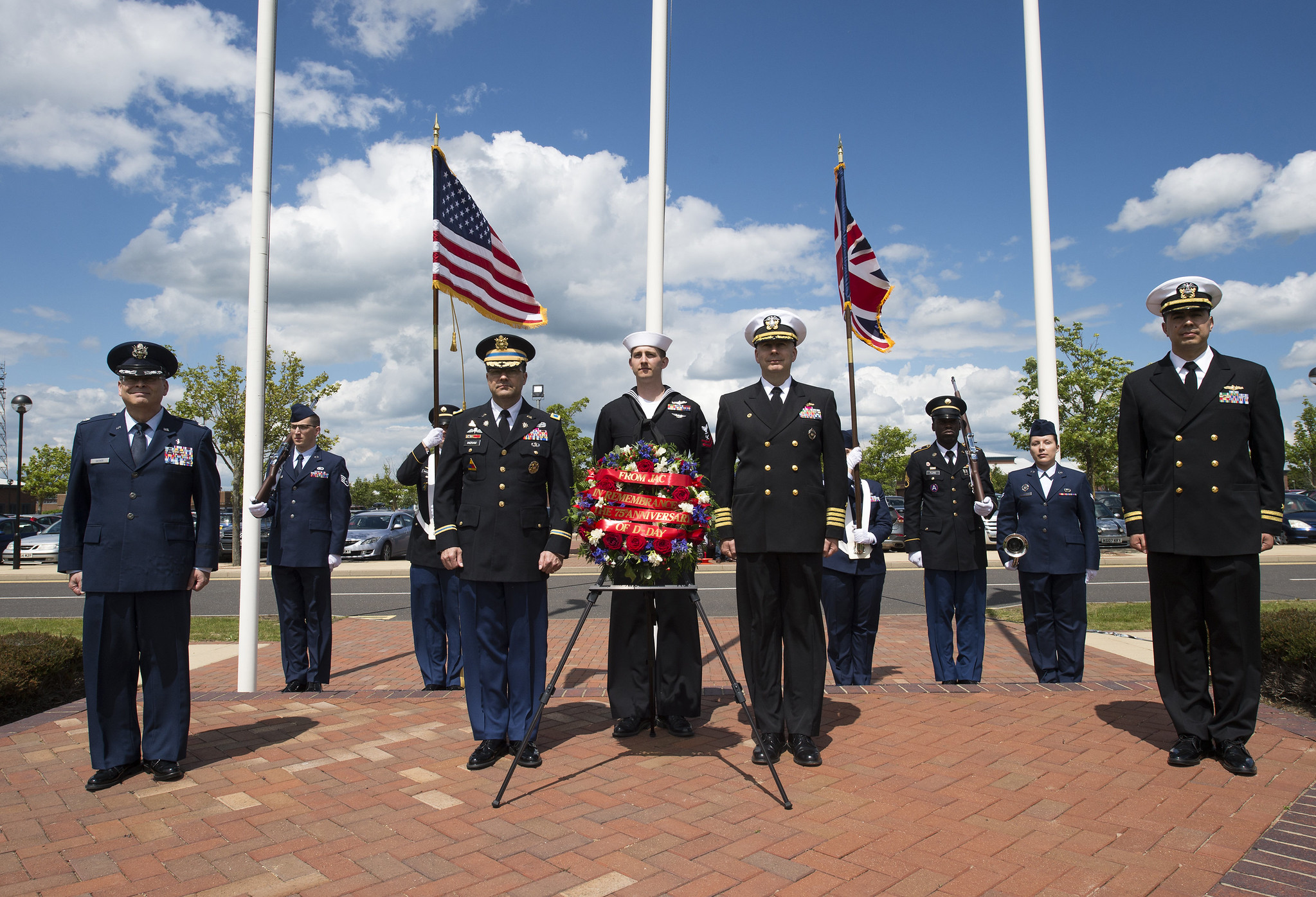 U.S. Army Colonel Matthew Ingram (center left) and U.S. Navy Captain Robert Hight (center right) display a memorial wreath during the JIOCEUR Analytic Center (JAC) 75th Anniversary of D-Day Ceremony at RAF Molesworth, England on June 6, 2019. During the ceremony, the JAC and RAF Molesworth community honored the men and women that served at the base in support of Operation Overlord and other D-Day operations. (U.S. Air Force photo by MSgt. Brian Kimball)