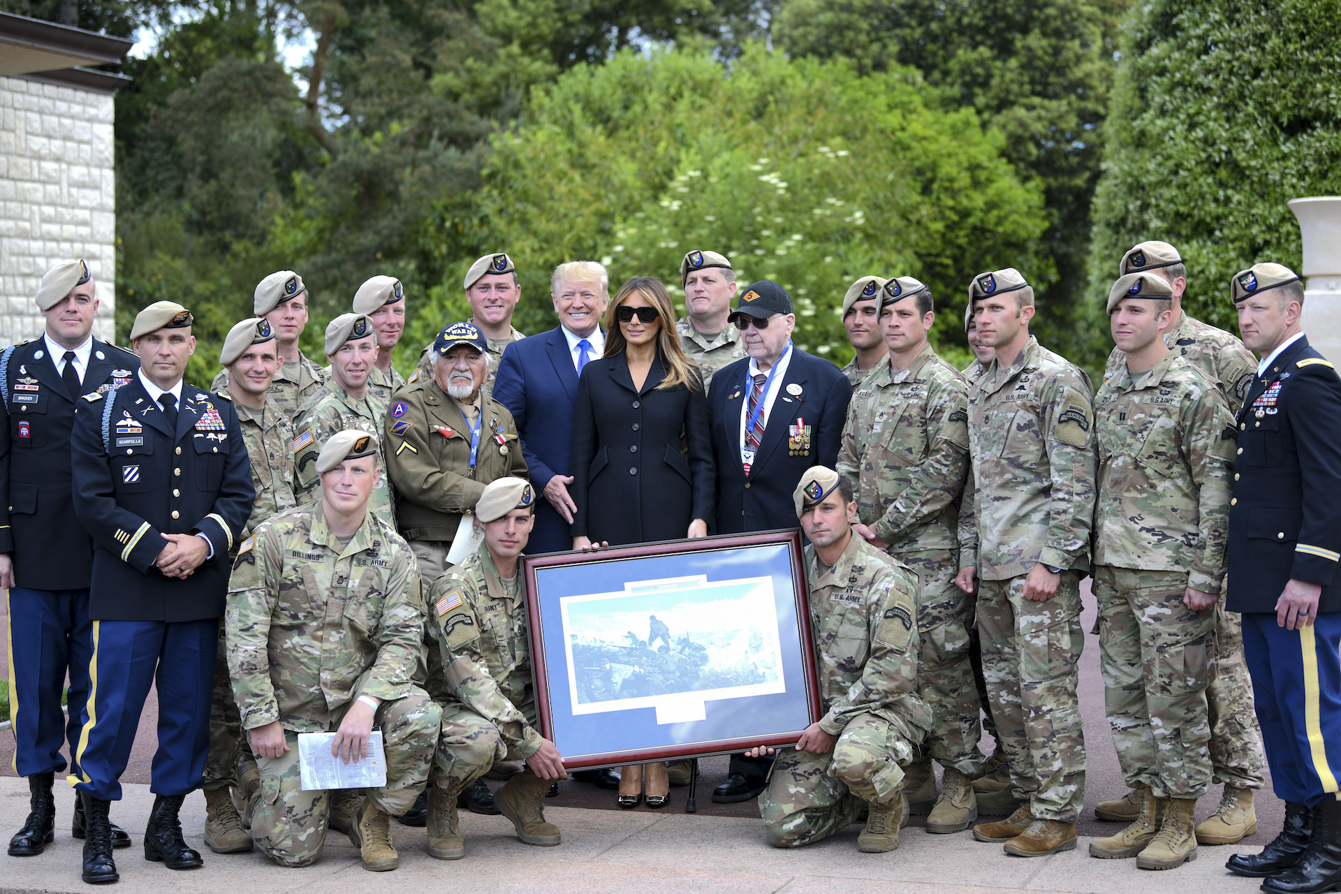 U.S. President Donald J. Trump and First Lady Melania Trump pose with Rangers from the 75th Ranger Regiment as well as a D-Day WWII veteran at the commemoration ceremony of the 75th anniversary of D-Day at the Normandy American Cemetery and Memorial, June 6, 2019. The ceremony is the apex of more than 80 events commemorating the 75th anniversary of D-Day, the largest multi-national amphibious landing and operational military airdrop in history, and highlighted the U.S. steadfast commitment to European allies and partners. More than 1,300 U.S. service members, partnered with 950 troops from across Europe and Canada, to converge in northwestern France to take part in the events that began June 1 and will continue until June 9. (U.S. Army photo by Spc. Austin Lockhart)