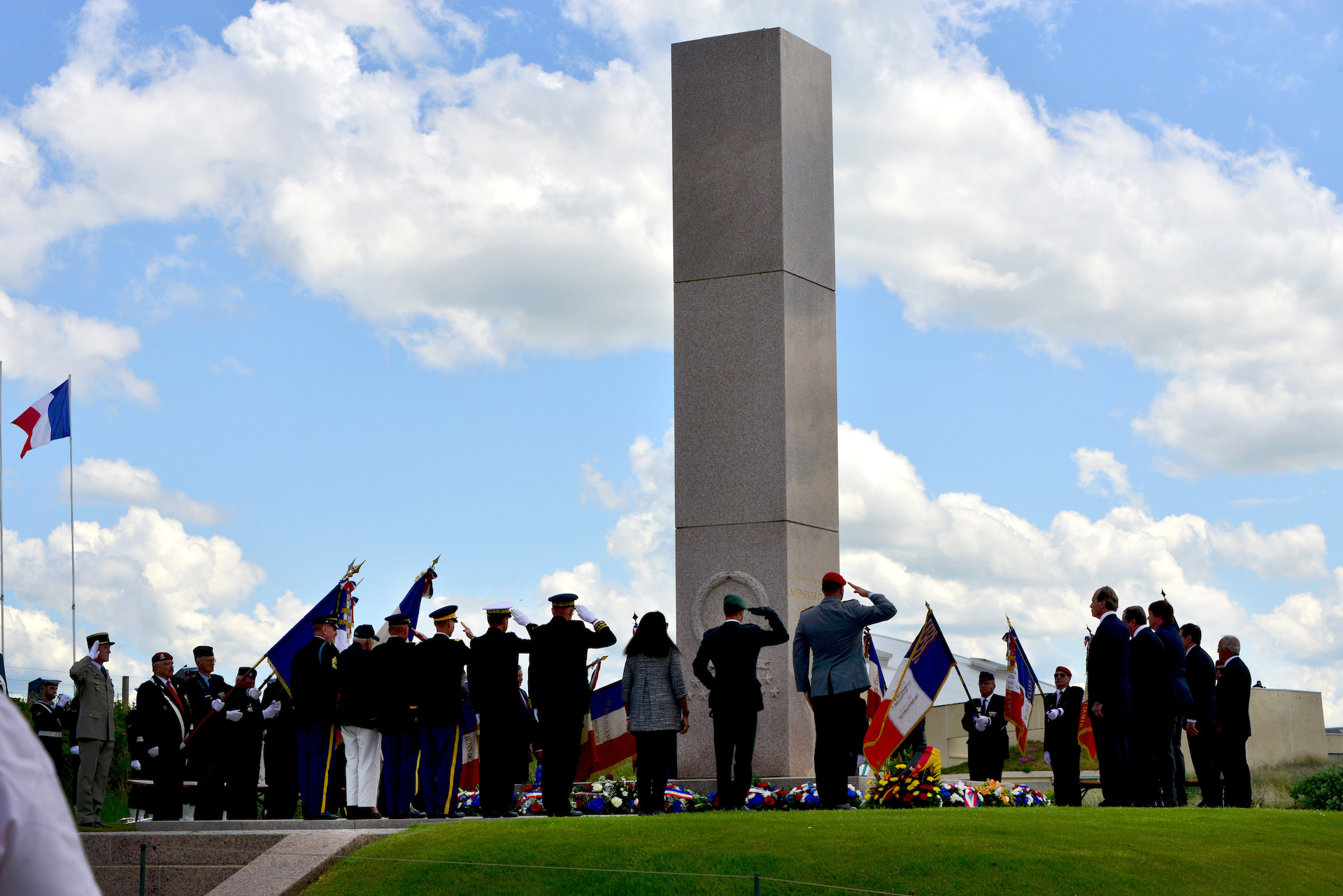 U.S. Soldiers of the 82nd Airborne Division and other dignitaries render a salute the at the American monument after laying bouquets in a ceremony to honor of the tactical and strategic leaders of Operation Overlord at Utah Beach, Sainte Marie du Mont, France, June 6, 2019. More than 1,300 U.S. Service Members, partnered with 950 troops from across Europe and Canada, have converged in northwestern France to commemorate the 75th anniversary of Operation Overlord, the WWII Allied invasion of Normandy, commonly known as D-Day. Upwards of 80 ceremonies in 40 French communities in the region will take place between June 1-9, 2019. (U.S. Army photo by Yvonne Najera)