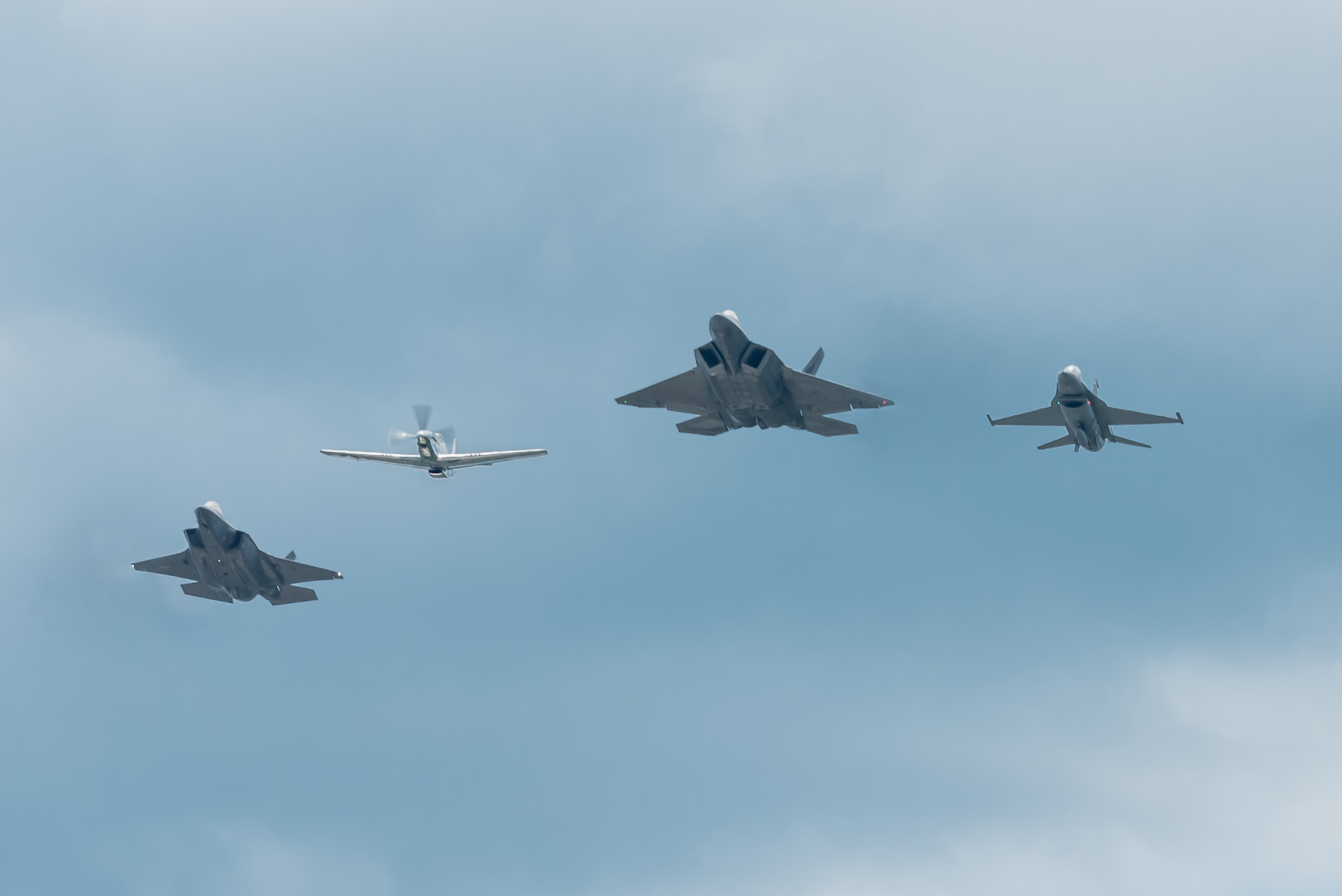 U.S. Air Force Maj. Paul Lopez, F-22 Demo Team pilot, flies alongside Maj. Garret Schmitz, F-16 Viper Demo Team pilot, Capt. Andrew Olson, F-35 Demo Team pilot, and Mr. Andrew McKenna, Air Force Heritage Flight Foundation P-51 Mustang pilot, during the 75th Anniversary D-Day Flyover in Bedford, Va. June 6, 2019. The four-ship formation performed two passes over the National D-Day Memorial to commemorate the service and sacrifice of those who stormed the beaches of Normandy 75 years ago. (U.S. Air Force photo by 2nd Lt. Samuel Eckholm)