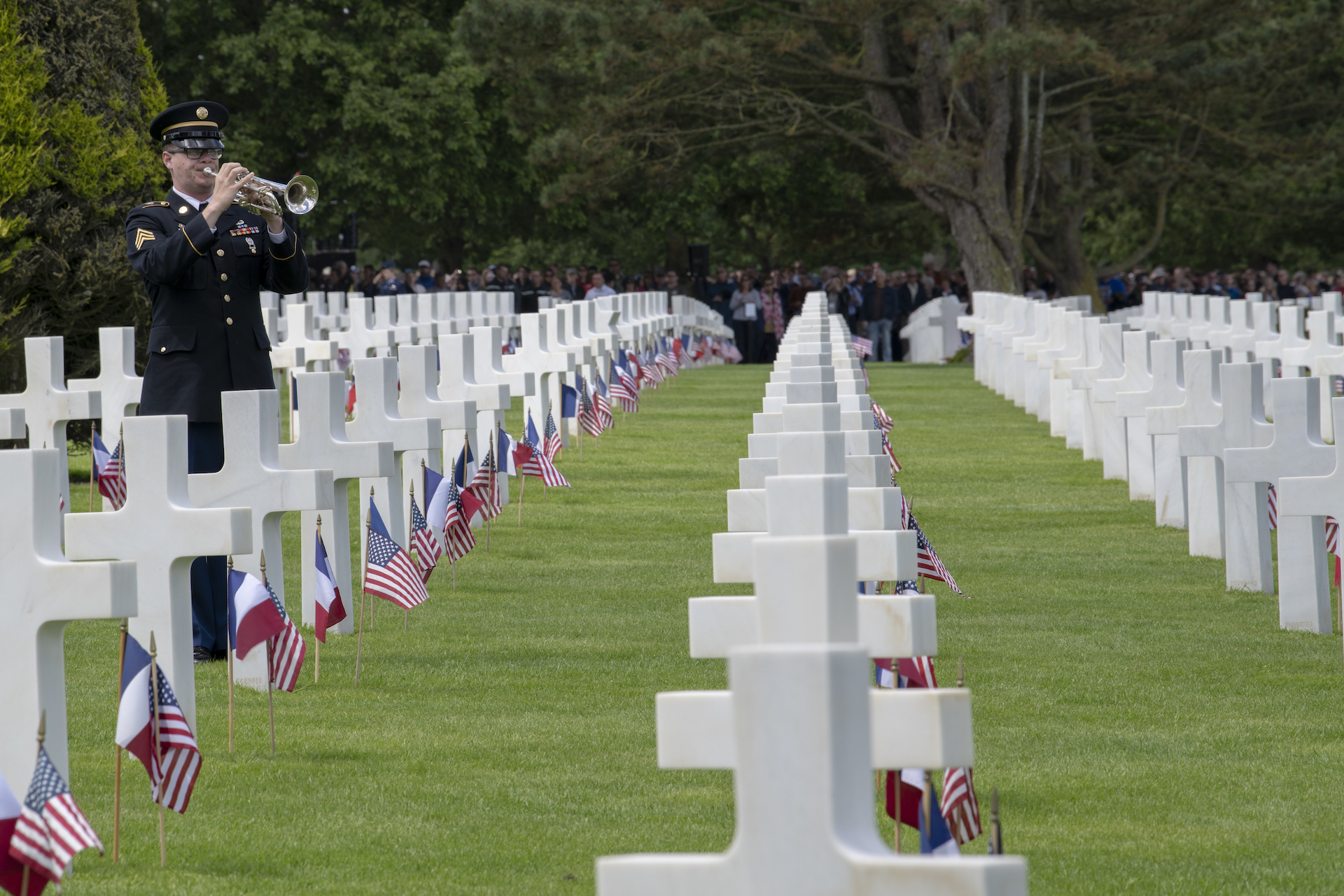 A bugler with the U.S. Army Europe Band plays "Taps" during a ceremony commemorating the 75th anniversary of D-Day, at the Normandy American Cemetery in France, June 6, 2019. The ceremony is the apex of more than 80 events commemorating the 75th anniversary of D-Day, the largest multi-national amphibious landing and operational military airdrop in history, and highlighted the U.S. steadfast commitment to European allies and partners. (U.S. Army photo by Sgt. Edward A. Salcedo)