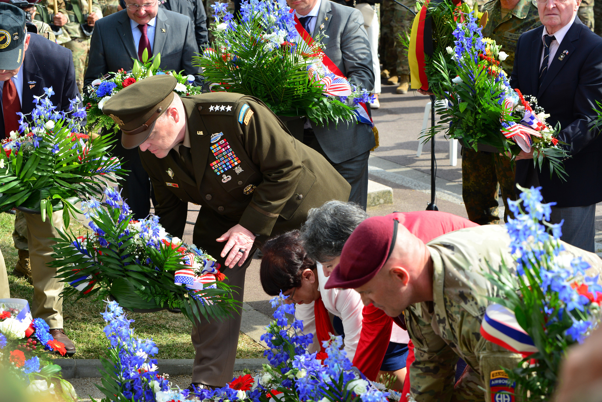 U.S. Army Gen. Mark A. Milley, Chief of Staff of the Army, lays flowers at the Sainte Mère Eglise, France monument to commemorate D-Day75, June 6, 2019. More than 1,300 U.S. Service Members, partnered with 950 troops from across Europe and Canada, have converged in northwestern France to commemorate the 75th anniversary of Operation Overlord, the WWII Allied invasion of Normandy, commonly known as D-Day. Upwards of 80 ceremonies in 40 French communities in the region will take place between June 1-9, 2019. (U.S. Army photo by Yvonne Najera)