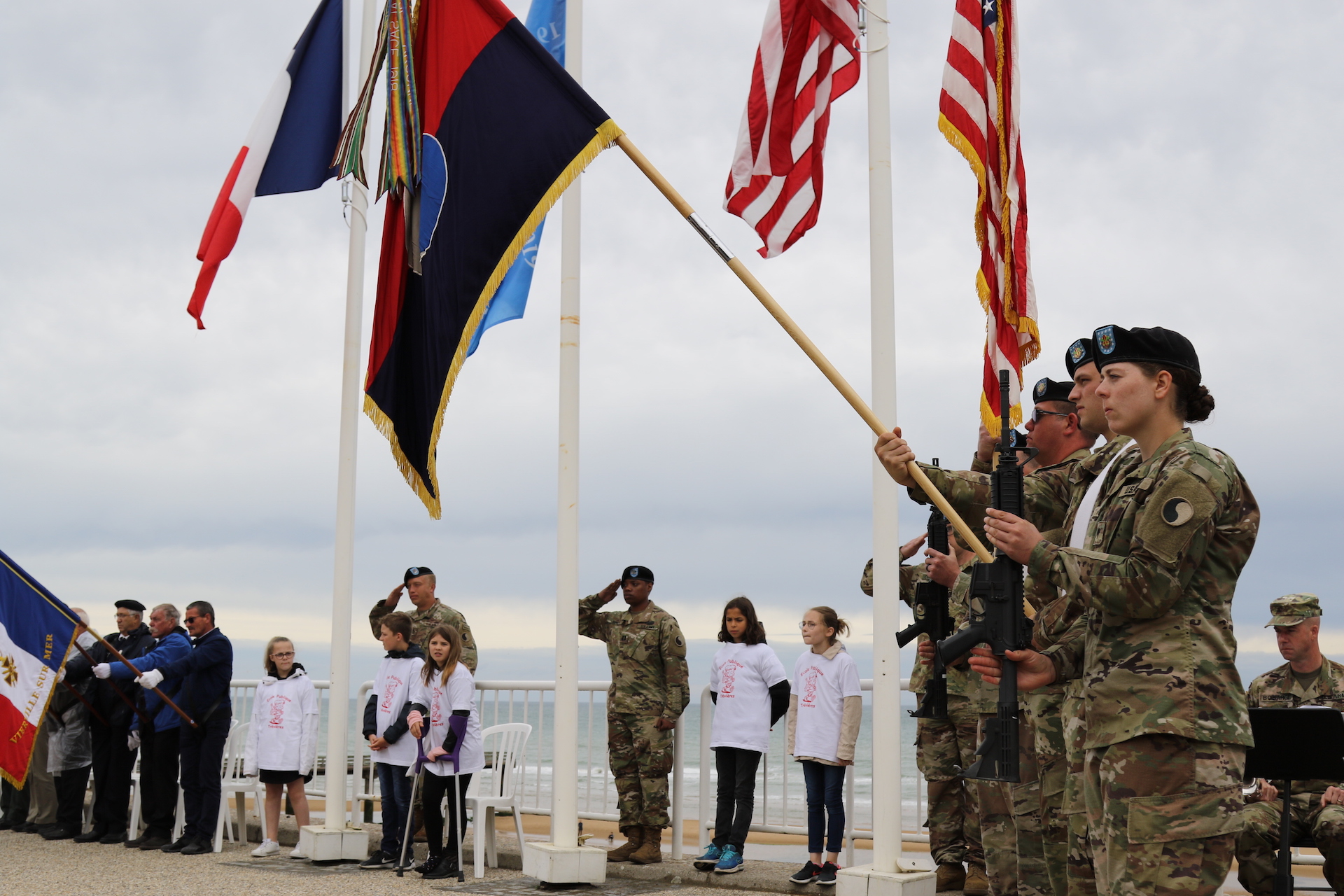 29th Infantry Division's Color guard present the colors during a commemoration ceremony for the U.S. Service Members that fought lost their lives on D-Day June 7, 2019 at Omaha Beach, Veirville-sur-Mer, France. More than 1,300 U.S. service members, partnered with 950 troops from across Europe and Canada, have converged in northwestern France to commemorate the 75th anniversary of Operation Overlord, the WWII Allied invasion of Normandy, commonly known as D-Day. Upwards of 80 ceremonies in 40 French communities in the region will take place between June 1-9, 2019, the apex being held June 6th at the American Cemetery at Coleville sur Mer. (U.S. Army Photo by Sgt. Andrew W. Mallett)