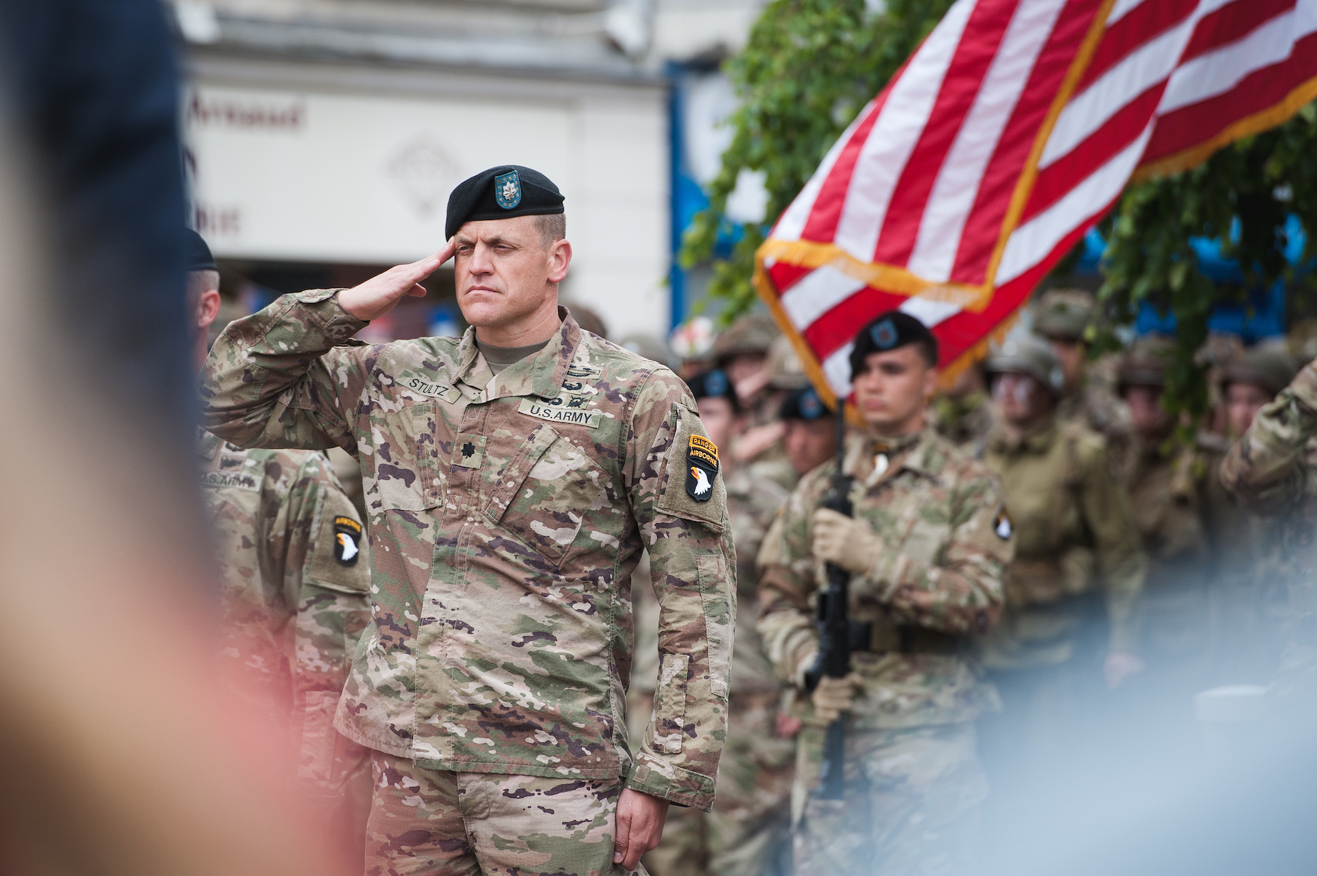 U.S. Army soldiers assigned to the 101st Abn. Div. render a salute during the playing of the national anthem at a memorial ceremony in Carentan, France, June 7, 2019. During the Ceremony, twenty-one “Screaming Eagle” Soldiers will conduct a reenlistment ceremony, led by General Mark A. Milley, former Deputy Commanding General for the 101st Abn. Divi., and the current U.S. Army Chief of Staff. The ceremony is arranged in the same manner as a June 20, 1944 ceremony in which then Div. Commander Maj. Gen. Maxwell Taylor presented awards to Screaming Eagle Soldiers in the Carentan Town Square, after the city’s liberation.