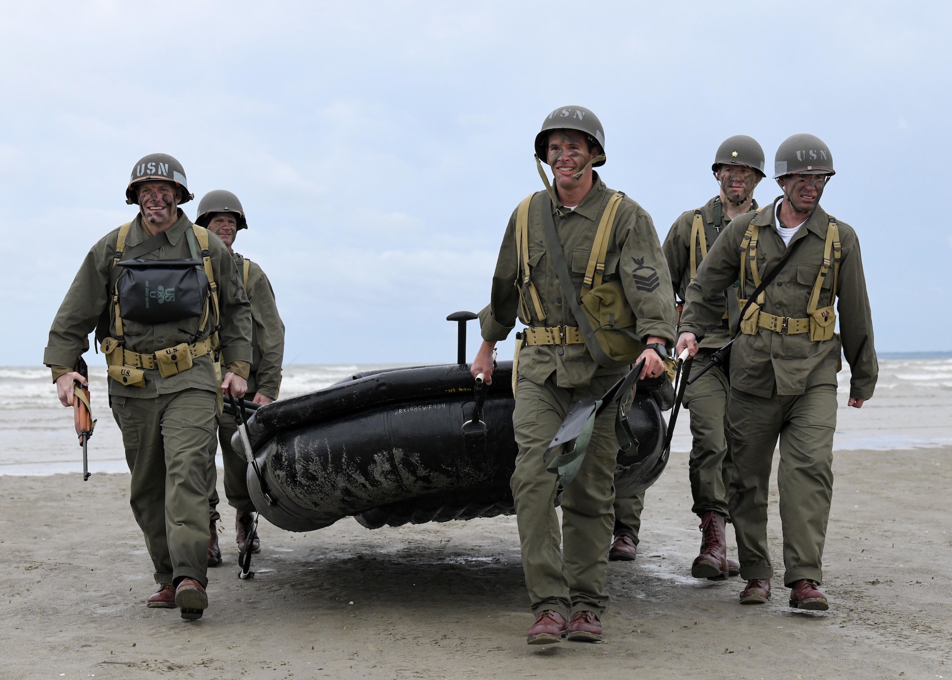 U.S. Navy SEALs assigned to Special Warfare Unit 2 re-enact the D-Day mission Navy Combat Demolition Unit Sailors conducted in the cover of darkness to clear the beaches for the main invading force on Utah Beach, June 6, 2019. More than 1,300 U.S. service members, partnered with 950 troops from across Europe and Canada, have converged in northwestern France to commemorate the 75th anniversary of Operation Overlord, the WWII Allied invasion of Normandy, commonly known as D-Day. Upwards of 80 ceremonies in 40 French communities in the region will take place between June 1-9, 2019. (U.S. Navy photo by Chief Mass Communication Specialist Michael McNabb/Released)
