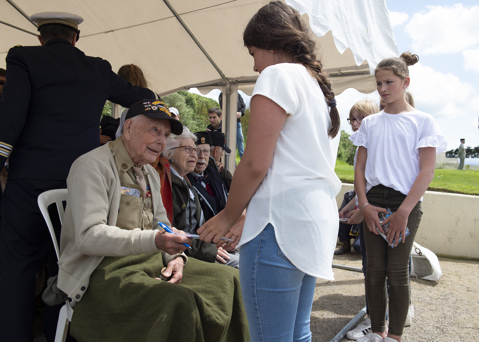 190606-N-HT014-1712 Sainte-Marie Du Mont, France (June 6, 2019) World War II veteran Mr. Eugene Kleindl signs an autograph for a local student after being presented with sand from Utah Beach, at the Utah Beach commemoration ceremony. The commemoration was held to honor the thousands of American Soldiers who landed and fought at Utah Beach on D-Day. More than 1,300 U.S. service members, partnered with 950 troops from across Europe and Canada to commemorate the 75th anniversary of Operation Overlord, the WWII Allied Invasion of Normandy, commonly known as D-Day. Upwards of 80 ceremonies in 40 French communities in the region will take place between June 1-9, the apex being held June 6th at the American Cemetery at Colleville-Sur-Mer. (U.S. Navy photo by Mass Communication Specialist 1st Class Ernesto Bonilla)