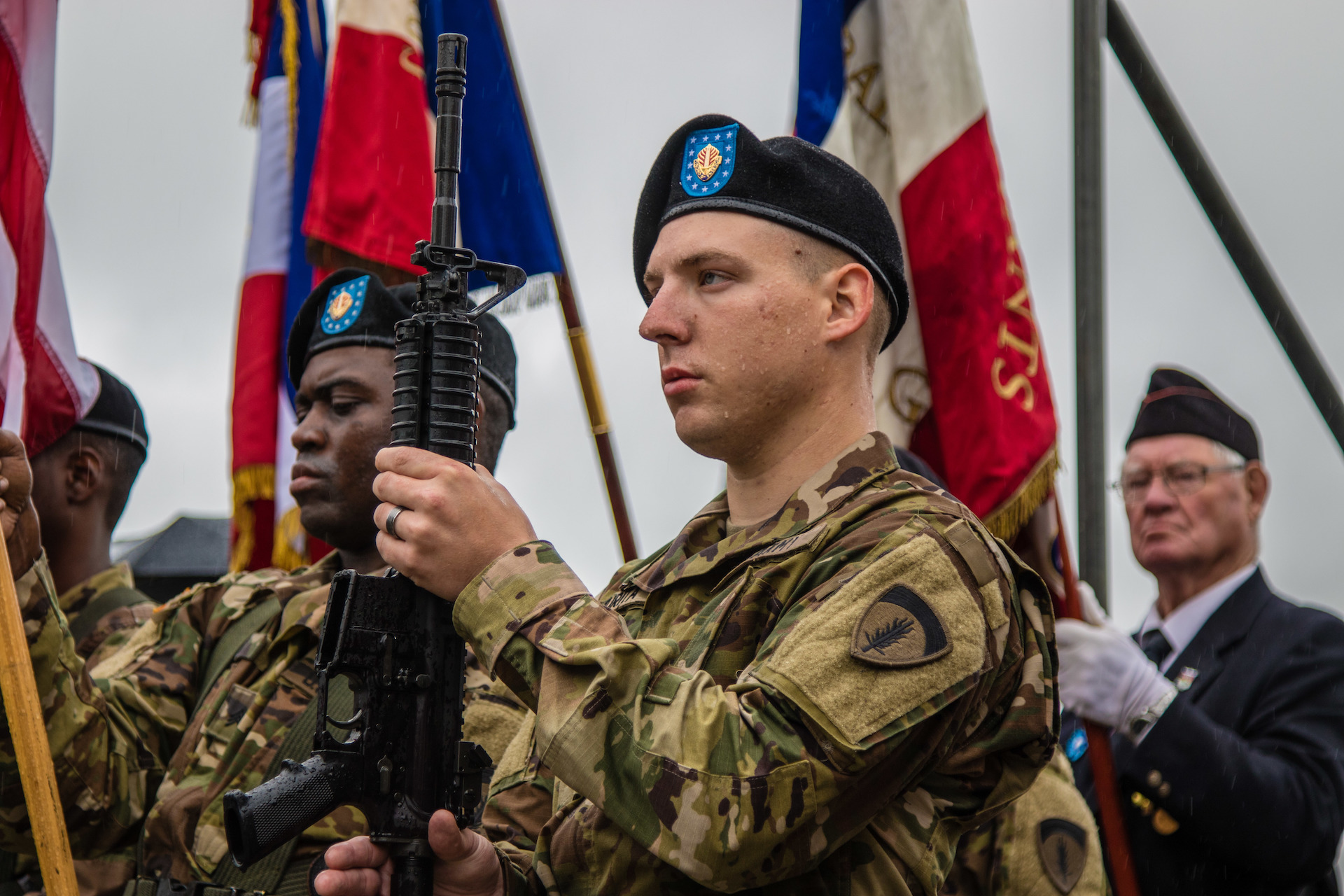Rain covered soldier renders honors at the first advanced headquarters of the Supreme Headquarters Allied Expeditionary Force and Dwight D. Eisenhower memorial ceremony in Tournieres, France on June 7. More than 1,300 U.S. Service Members, partnered with with 950 troops from across Europe and Canada have converged in northwestern France to commemorate the 75th anniversary of Operation Overlord, the WWII Allied Invasion of Normandy, commonly known as D-day. Upwards of 80 ceremonies in 40 French communities in the region will take place between June 1-9, 2019. U.S. Army photo by Sgt. Dommnique Washington, 7th Mobile Public Affairs Detachment.