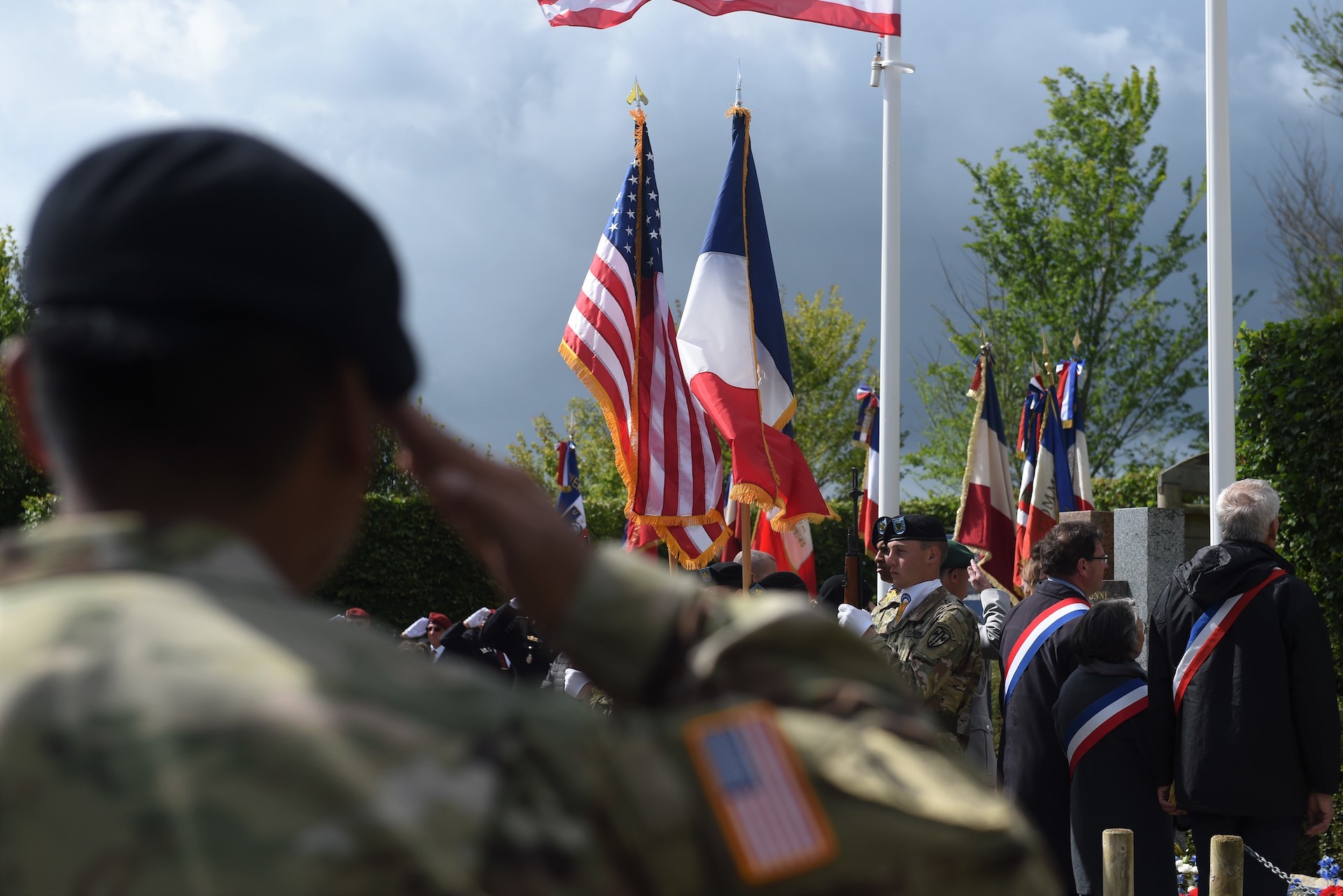 A U.S Army Service Member salutes the flags at the Allied Prison of War Camp ceremony in Foucarville, France, June 8, 2019. More than 1,300 U.S. Service Members, partnered with 950 troops from across Europe and Canada, have converged in northwestern France to commemorate the 75th anniversary of Operation Overlord, the WWII Allied Invasion of Normandy, commonly known as D-Day. Upwards of 80 ceremonies in 40 French communities in the region will take place between June 1-9, 2019.