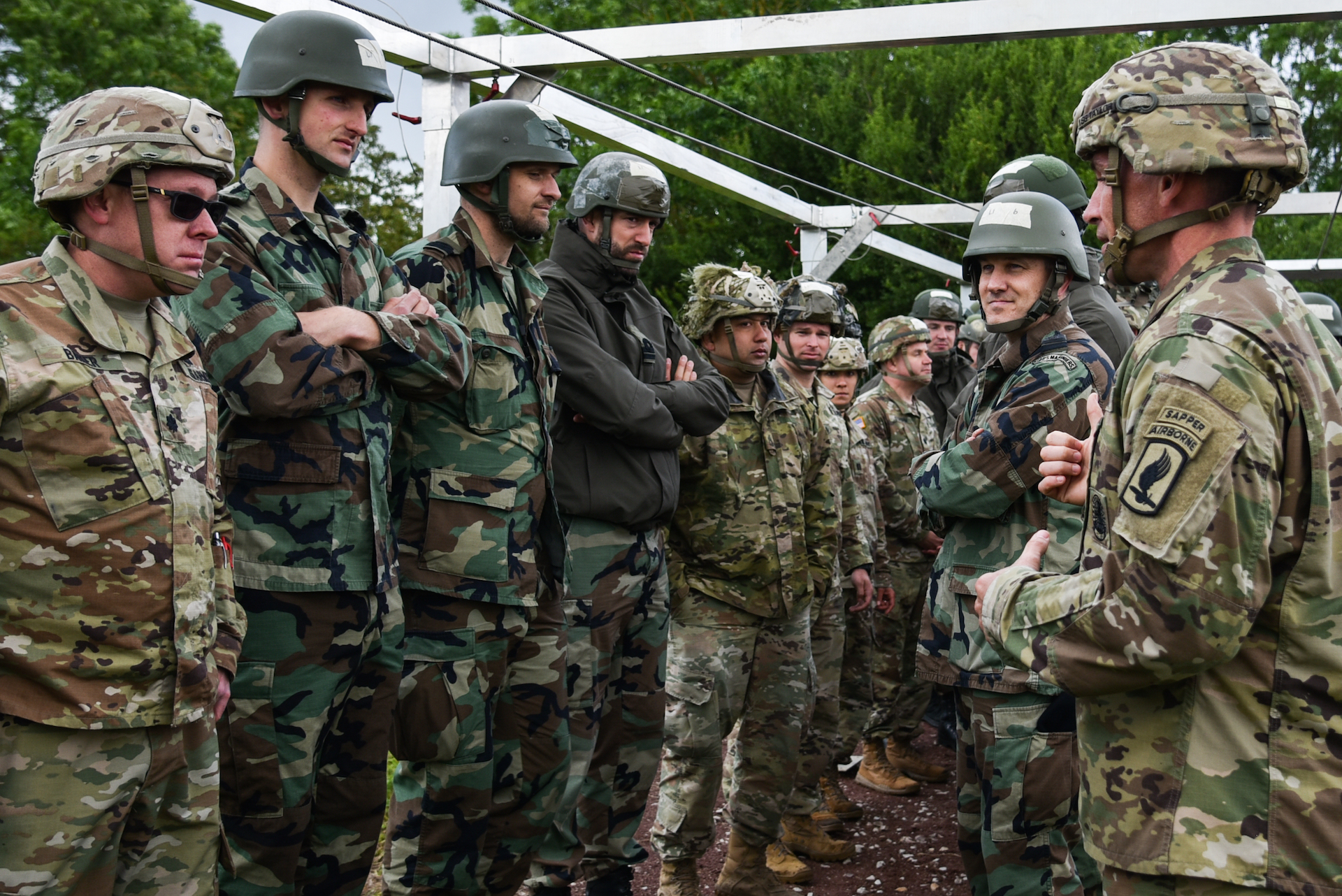 U.S. Army 1st Sgt. Glen Taylor assigned to the 54th Brigade Engineer Battalion, 173rd Airbrone Brigade instructs U.S. Soldiers assigned to various units and Dutch soldiers during pre-jump training in Sainte-Mère-Église, Normandy France, June 8, 2019. More than 1,300 U.S. Service Members, partnered with 950 troops from across Europe and Canada, have converged in northwestern France to commemorate the 75th anniversary of Operation Overlord, the WWII Allied Invasion of Normandy, commonly known as D-Day. Upwards of 80 ceremonies in 40 French communities in the region will take place between June 1-9, 2019. (U.S. Army photo by Sgt. Emily Houdershieldt)