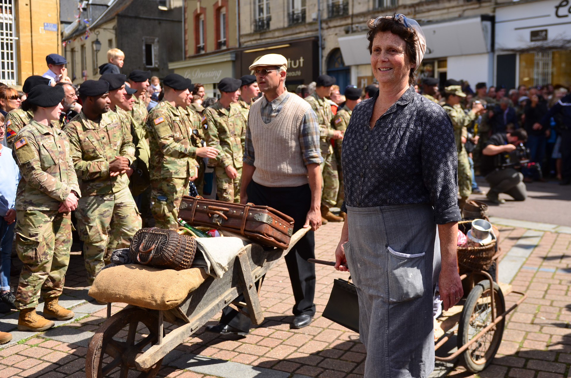 In honor of the paratroopers of the 101st Airborne Division and the WWII veterans present for the 75th D-Day anniversary, civilians dressed in 1940 period clothing and uniforms march through the town of Carentan, France, June 8. More than 1,300 U.S. Service Members, partnered with 950 troops from across Europe and Canada, have converged in northwestern France to commemorate the 75th anniversary of Operation Overlord, the WWII allied Invasion of Normandy, commonly known as D-Day. Upwards of 80 ceremonies in 40 French communities in the region are scheduled to take place between June 1-9, 2019.