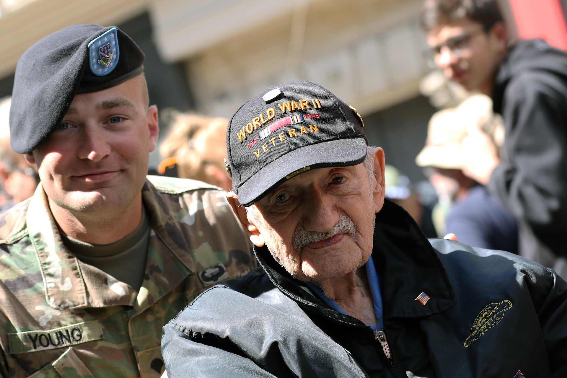 Spc. Jacoby Young(left), and World War II Veteran Norman Duncan(right), attend the Liberty March Arrival in Carentan, France, June 8, 2019. More than 1,300 U.S. Service Members partnered with 950 troops from across Europe and Canada have converged in northwestern France to commemorate the 75th anniversary of Operation Overlord, the WWII Allied Invasion of Normandy, commonly known as D-Day. Upwards of 80 ceremonies in 40 French communities in the region will take place between June 1-9, 2019, the apex being held June 6th at the American Cemetery at Colleville-sur-Mere. (U.S. Army photo by Pfc. Alisha Edwards, 7th Mobile Public Affairs Detachment)