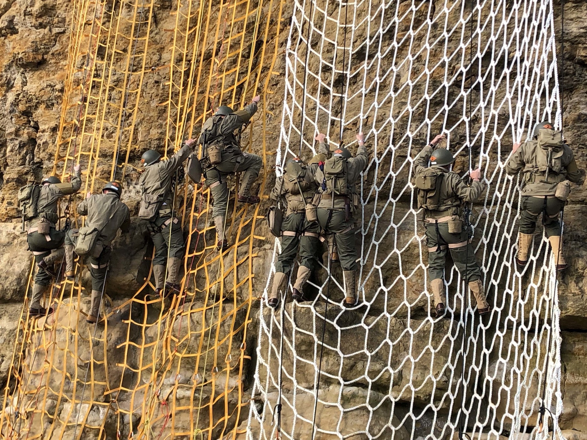 U.S. Army Rangers assigned to the 75th Ranger Regiment, climb the cliffs at Pointe du Hoc, in Cricqueville en Bessin, while donning World War II era uniforms, June 5, 2019. Rangers scaled the cliff to honor the 135 men killed or wounded from the 2d and 5th Ranger Battalions while capturing and holding Pointe du Hoc. More than 1,300 U.S. service members, partnered with 950 troops from across Europe and Canada, have converged in northwestern France to commemorate the 75th anniversary of Operation Overlord, the World War II Allied invasion of Normandy, commonly known as D-Day. Upwards of 80 ceremonies in 40 French communities in the region will take place between June 1-9, 2019. (U.S. Navy photo by Chief Mass Communication Specialist Michael McNabb/Released)