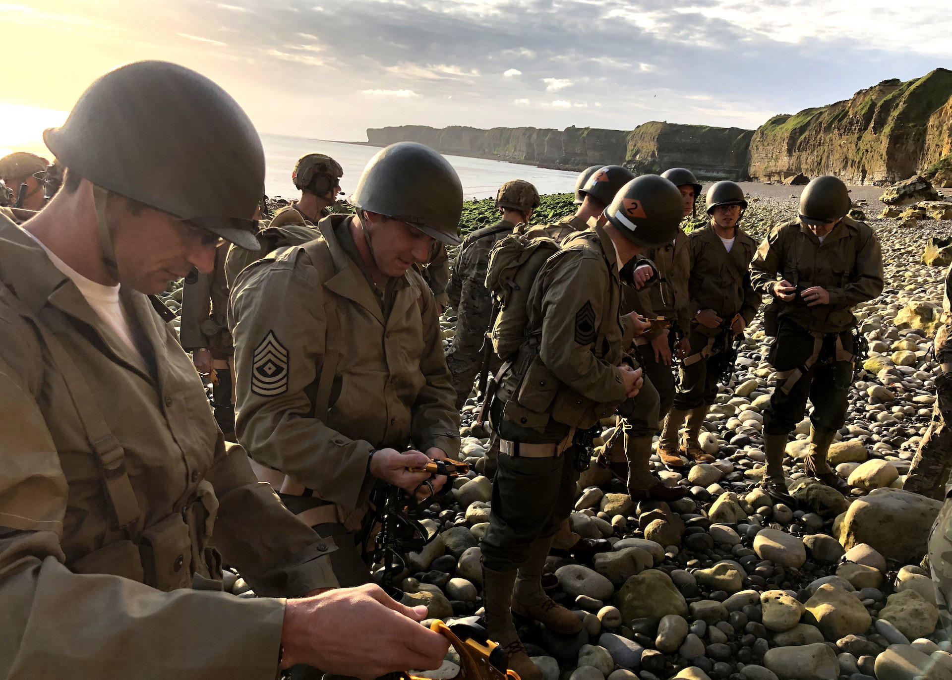 U.S. Army Rangers assigned to the 75th Ranger Regiment prepare to climb the cliffs at Pointe du Hoc, in Cricqueville en Bessin, while donning World War II era uniforms, June 5, 2019. Rangers scaled the cliff to honor the 135 men killed or wounded from the 2d and 5th Ranger Battalions while capturing and holding Pointe du Hoc. More than 1,300 U.S. service members, partnered with 950 troops from across Europe and Canada, have converged in northwestern France to commemorate the 75th anniversary of Operation Overlord, the World War II Allied invasion of Normandy, commonly known as D-Day. Upwards of 80 ceremonies in 40 French communities in the region will take place between June 1-9, 2019. (U.S. Navy photo by Chief Mass Communication Specialist Michael McNabb/Released)