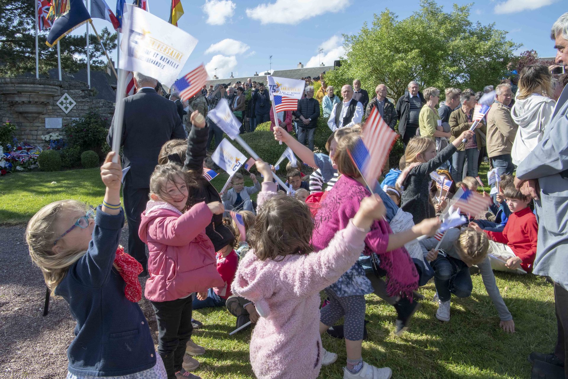 French schoolchildren wave American flags during the playing of The Star-Spangled Banner at a ceremony commemorating the 75th anniversary of 4th Infantry Division's liberation of the town of Montebourg, France, June 8, 2019. The ceremony, which honored the sacrifices of the 4th Infantry Division as well as the French citizens who died as result of the fighting, featured Soldiers from 4 ID, French dignitaries from the region, and schoolchildren from the town. (U.S. Army Photo by Sgt. Edward A. Salcedo)