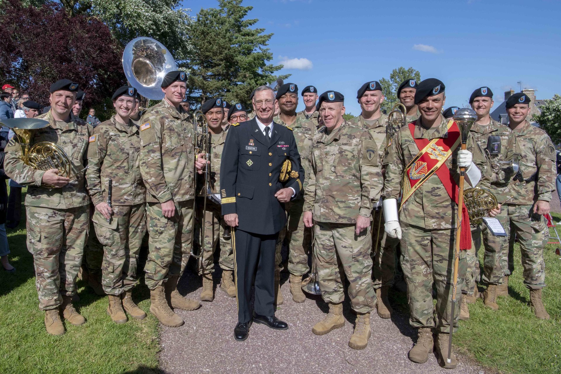 Lt. Gen. Theodore D. Martin, deputy commanding general of U.S. Army Training and Doctrine Command, poses with members of the U.S. Army Europe Band at the conclusion of a ceremony commemorating 75 years since the 4th Infantry Division liberated the town of Montebourg, France, June 8, 2019. The ceremony, which honored the sacrifices of the 4th Infantry Division as well as the French citizens who died as result of the fighting, featured Soldiers from 4 ID and the U.S. Army Europe Band, French dignitaries from the region, and schoolchildren from the town. (U.S. Army Photo by Sgt. Edward A. Salcedo)