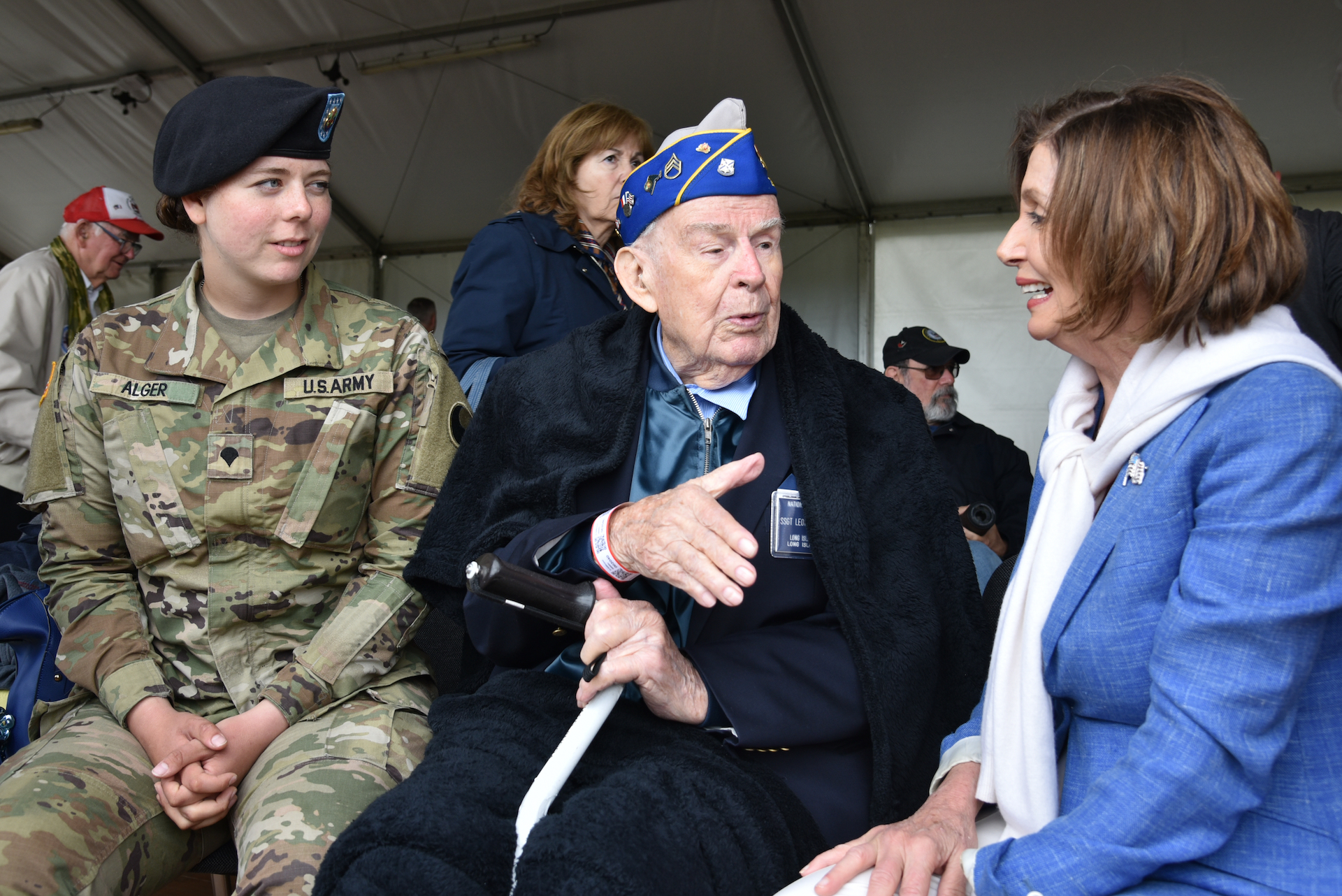 Speaker of the House Nancy Pelosi, right, talks with a World War II Veteran, left, and a U.S. Soldier assigned to the 29th Infantry Division during a congressional delegation in La Fiere, Normandy, France, June 9, 2019. The bi-partisan congressional delegation allowed U.S. government officials to join WWII veterans, active duty service members, and foreign dignitaries during observances of the 75th anniversary of D-Day. More than 1,300 U.S. Service Members, partnered with 950 troops from across Europe and Canada, have converged in northwestern France to commemorate the 75th anniversary of Operation Overlord, the WWII Allied Invasion of Normandy, commonly known as D-Day. Upwards of 80 ceremonies in 40 French communities in the region will take place between June 1-9, 2019. (U.S. Army photo by Sgt. Emily Houdershieldt)
