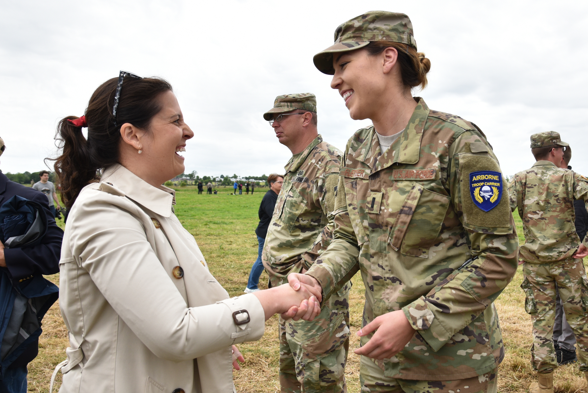 U.S. Rep. Elise Stefanik from New York, left, shakes hands with a U.S. Air Force 1st Lt. Michelle Fletcher assigned to the 86th Airlift Wing during a congressional delegation in La Fiere, Normandy, France, June 9, 2019. The bi-partisan congressional delegation allowed U.S. government officials to join veterans, active duty service members, and foreign dignitaries during observances of the 75th Anniversary of D-Day. More than 1,300 U.S. Service Members, partnered with 950 troops from across Europe and Canada, have converged in northwestern France to commemorate the 75th anniversary of Operation Overlord, the World War II Allied Invasion of Normandy, commonly known as D-Day. Upwards of 80 ceremonies in 40 French communities in the region will take place between June 1-9, 2019. (U.S. Army photo by Sgt. Emily Houdershieldt)