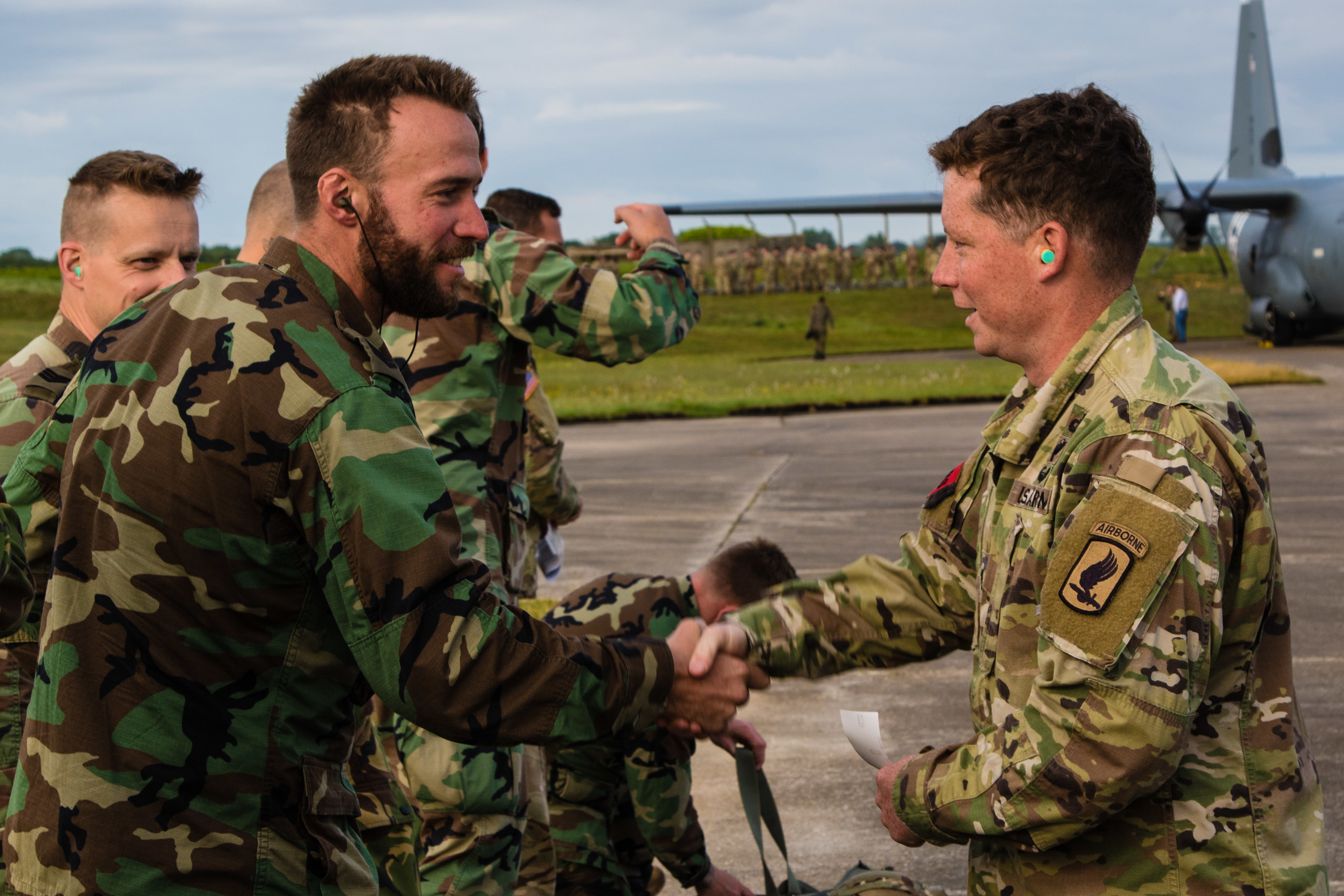 Service Members form different militaries trade unit patches prior to airborne operation at Cherbourg – Maupertus Airport on June 9. More than 1,100 parachutes sailed above Sainte-Mere-Eglise, France, to commemorate the 75th Anniversary of D-Day June 9, 2019. Allied Forces began the liberation of Europe on the beaches and in the skies of Normandy during WWII. Nineteen aircraft from multiple nations and paratroopers from Belgium, France, Germany, the Netherlands, Romania, United Kingdom and the United States dropped civilians and Soldiers, both freefall and static line, in front of tens of thousands of spectators. Over 1,300 U.S. personnel have been supporting more than 80 ceremonies in the region since June 1. U.S. Army photo by Sgt. Dommnique Washington, 7th Mobile Public Affairs Detachment