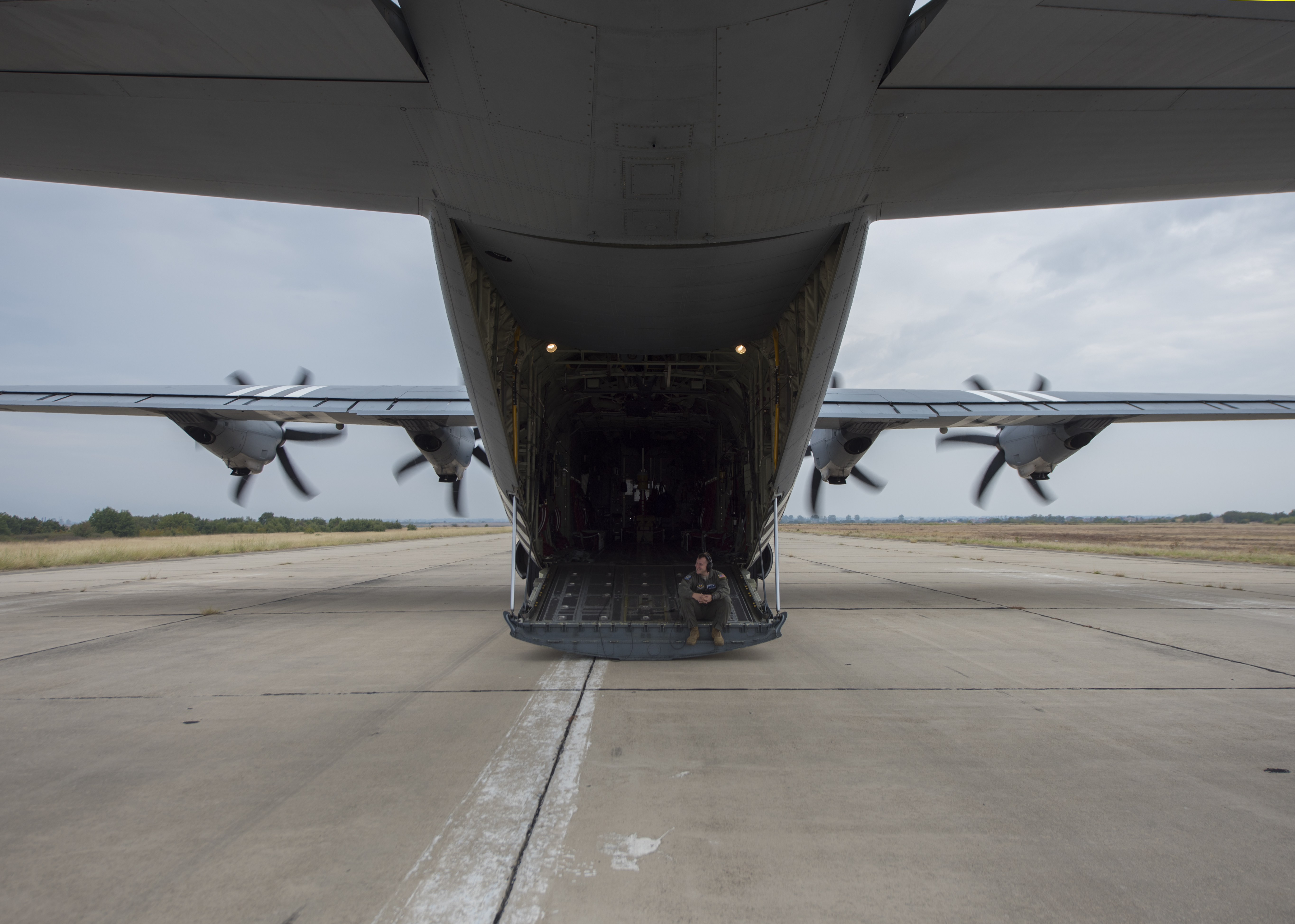 U.S. Air Force Senior Airman Robert Hutton, a loadmaster assigned to the 37th Airlift Squadron, waits on the ramp of a C-130J Super Hercules for the next load of jumpers in Plovdiv, Bulgaria, Sept. 24, 2019. The military free fall course is a central focus of Thracian Fall 2019. (U.S. Air Force photo by Staff Sgt. Kirsten Brandes)