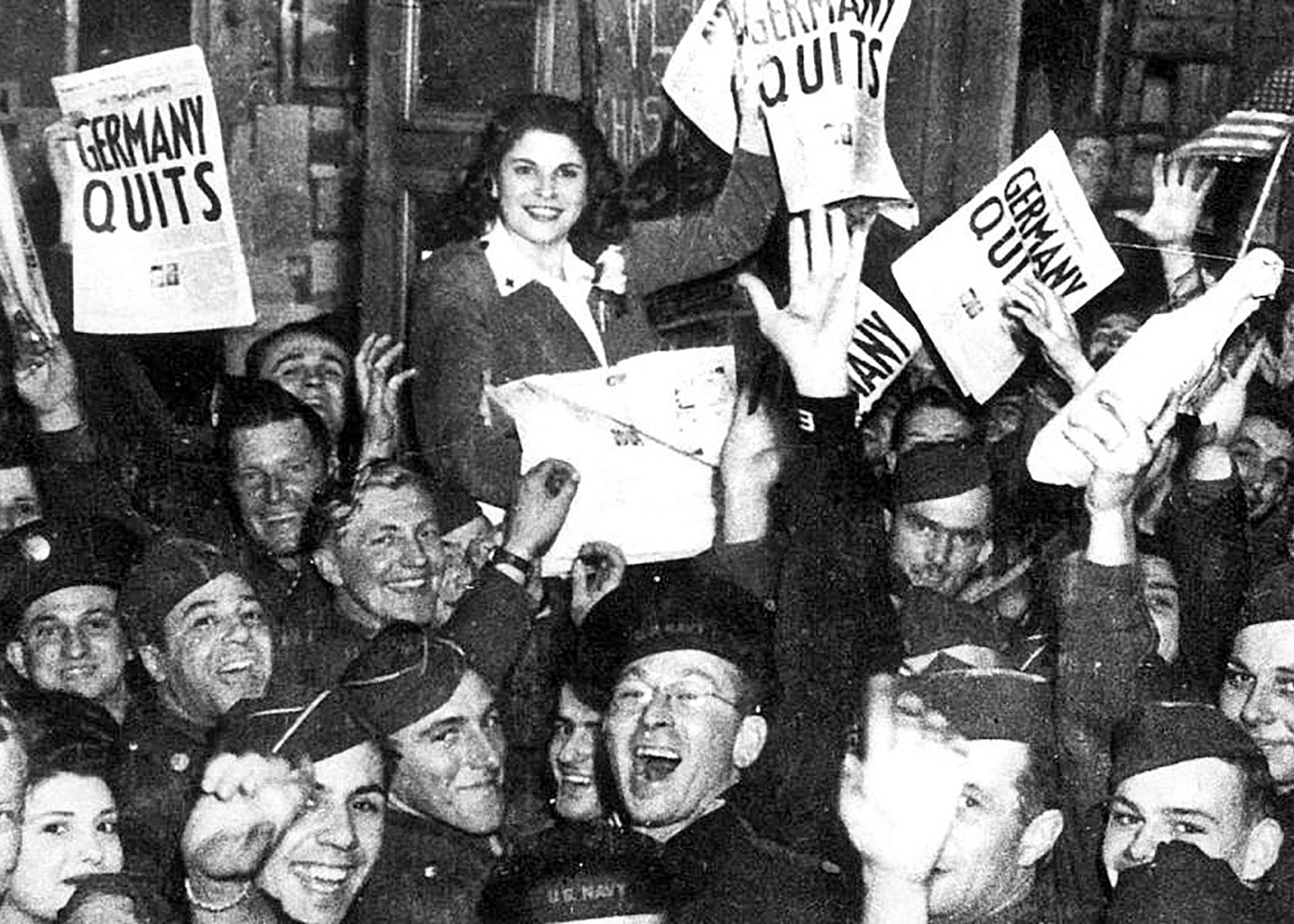 The revelers hold a copy of the May 8, 1945, London edition of the Stars and Stripes
