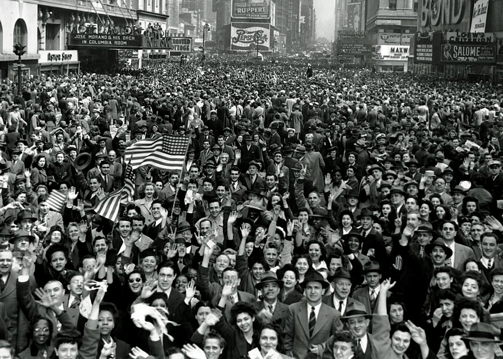 Looking north from 44th Street, New York's Times Square is packed Monday, May 7, 1945, with cw3-rowds celebrating the news of Germany's unconditional surrender in World War II