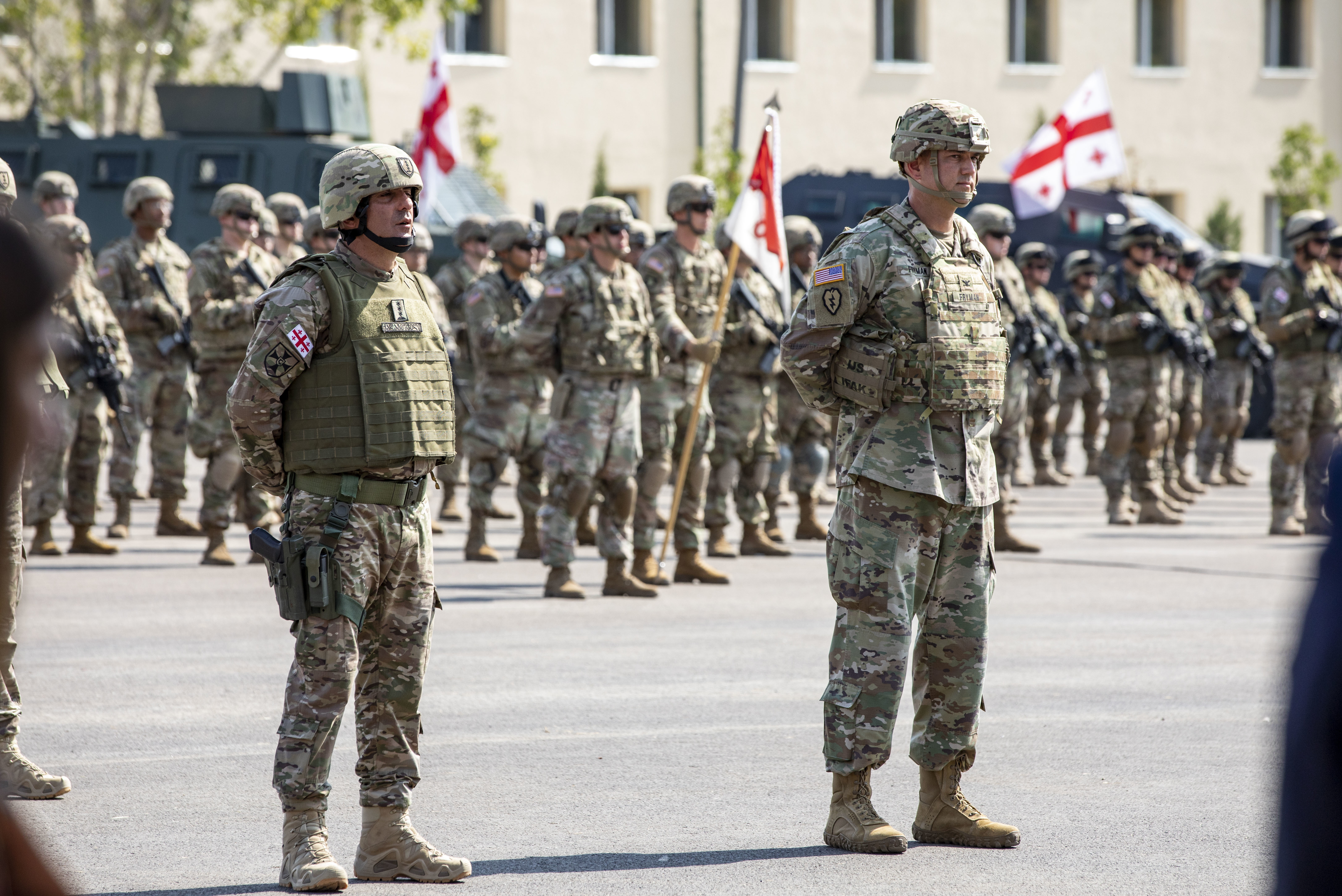 Georgian Defense Forces Col. Irodi Kadagishvili, Deputy Commander of East Command, and Georgia Army National Guardsmen Col. Jason Fryman, U.S. Exercise Director of Noble Partner 20, participate in the opening ceremony at Vaziani Training Area, Georgia, Sept. 7, 2020. The Georgia National Guard and the country of Georgia have participated in the U.S. Army National Guard State Partnership Program for 26-years ensuring interoperability, functionality, and regional stability. U.S. Army photo by Sgt. Jordan Trent