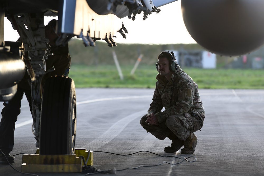 A crew chief assigned to the 48th Fighter Wing prepares a U.S. Air Force F-15E Strike Eagle assigned to Royal Air Force Lakenheath, England, for takeoff in support of a combined readiness exercise, at Aalborg Air Base, Denmark, Oct. 31, 2020. Multilateral Agile Combat Employment exercises within the Baltic airspace and surrounding nations enable U.S forces in Europe to protect and defend partners, allies and generate lethal combat air power should deterrence fail. (U.S. Air Force photo by Senior Airman Christopher S. Sparks)
