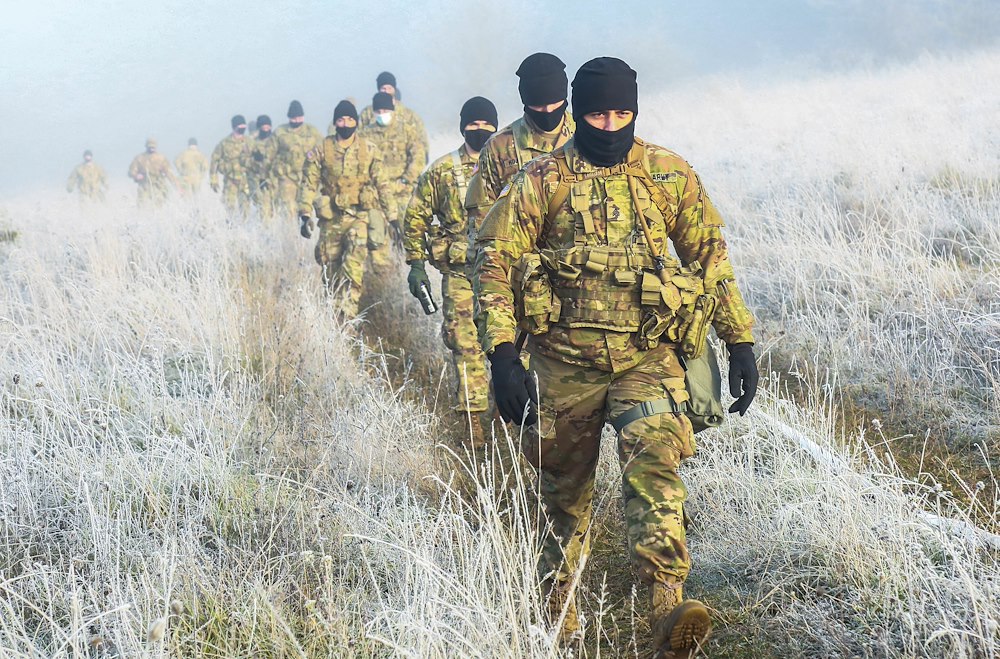 U.S. Army Soldiers assigned to the Joint Multinational Readiness Center get a pace count before land navigation training during Expert Infantry and Expert Soldier Badge competition at Hohenfels, Germany on Nov. 6, 2020. Expert Infantry Badge (EIB) and Expert Soldier Badge (ESB) recognize Soldiers who have demonstrated a mastery of critical tasks. These tasks build on the foundation of individual proficiency, allowing them to locate, close with and destroy the enemy. (U.S. Army photo by Sgt. Audrequez Evans).