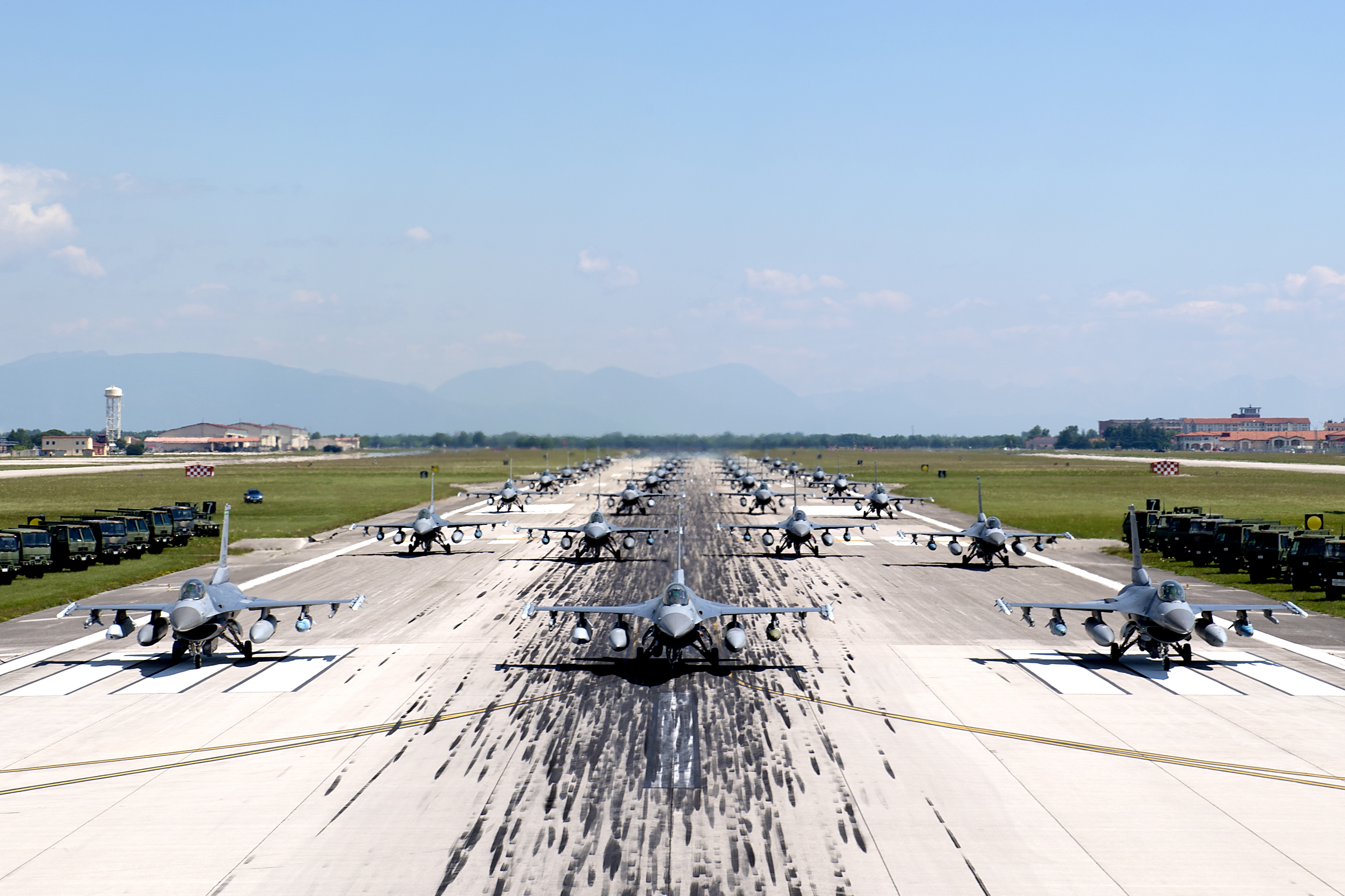 U.S. Air Force aircraft and vehicles assigned to the 31st Fighter Wing (FW) line the runway during an elephant walk at Aviano Air Base, Italy, June 1, 2020. Despite the restrictions in place due to COVID-19, the 31st FW remains lethal and combat ready, prepared to deter or defeat any adversary who threatens US or NATO interests. (U.S. Air Force photo by Staff Sgt. Kelsey Tucker)