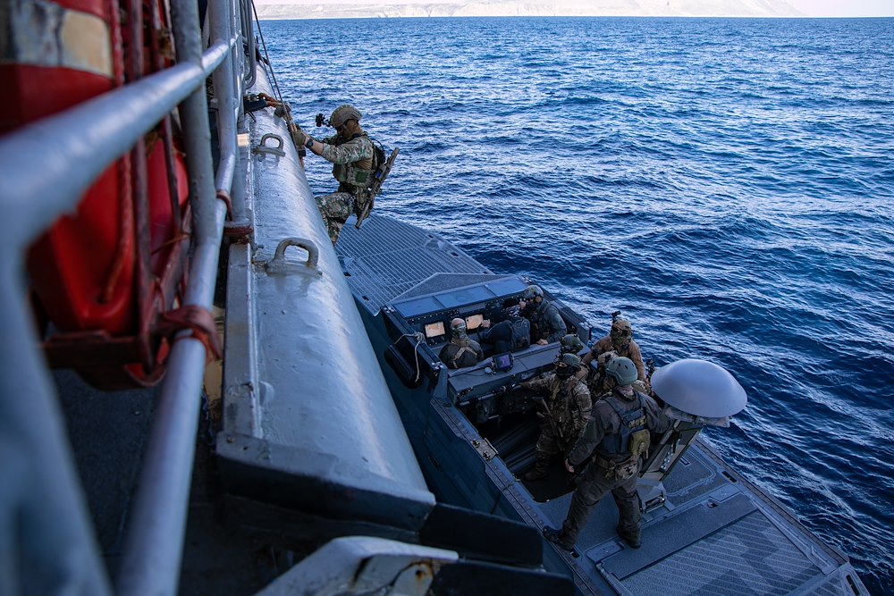Naval special operations forces from the Greek Underwater Demolition Team (DYK) and Cypriot Underwater Demolition Team (UDT) climb from a Combatant-craft assault onto the HS Kanaris during Visit Board Search and Seizure (VBSS) in Souda Bay, Greece, January 11-29. This trilateral maritime exercise strengthened cooperation and combined capabilities between Greece, Cyprus, and the United States in the European theater to better enable global operations.