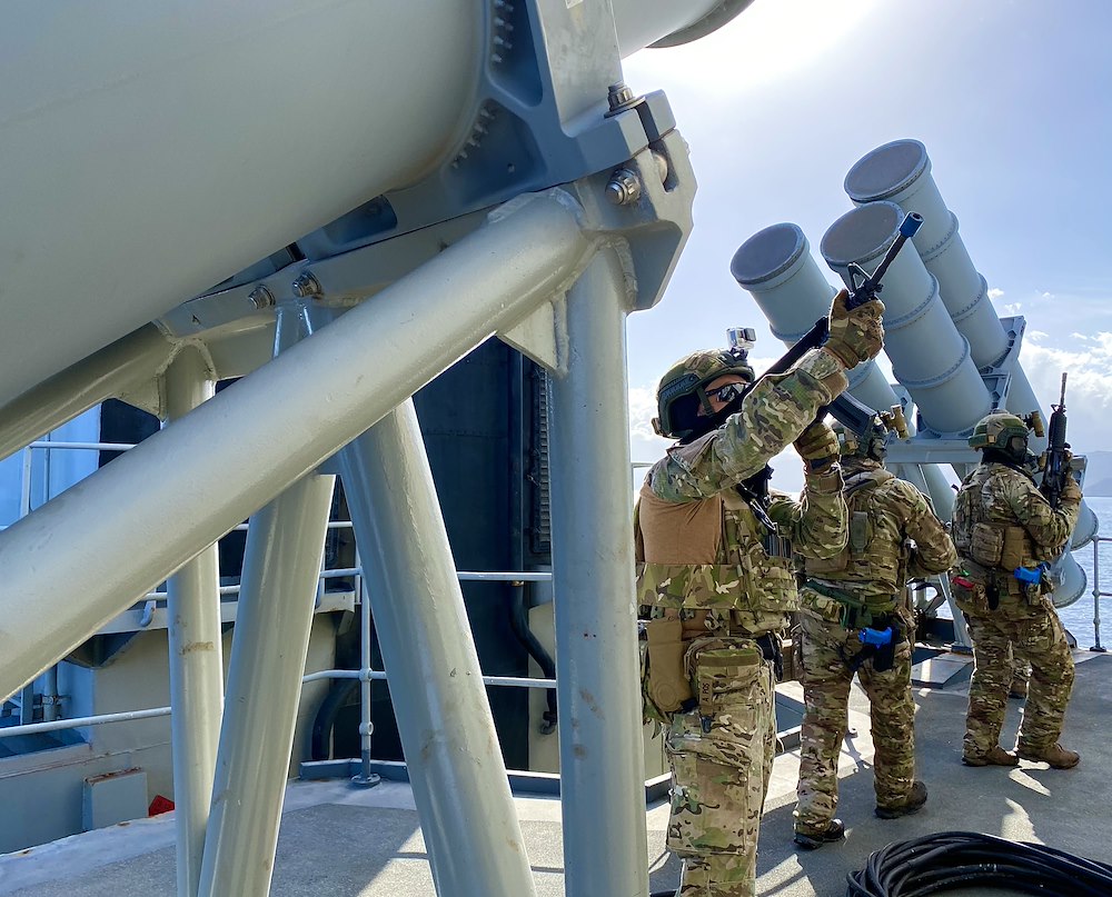 Naval special operations forces from the Greek Underwater Demolition Team (DYK) and Cypriot Underwater Demolition Team (UDT) secure an area of the HS Kanaris during Visit Board Search and Seizure (VBSS) in Souda Bay, Greece, January 11-29. This trilateral maritime exercise strengthened cooperation and combined capabilities between Greece, Cyprus, and the United States in the European theater to better enable global operations.