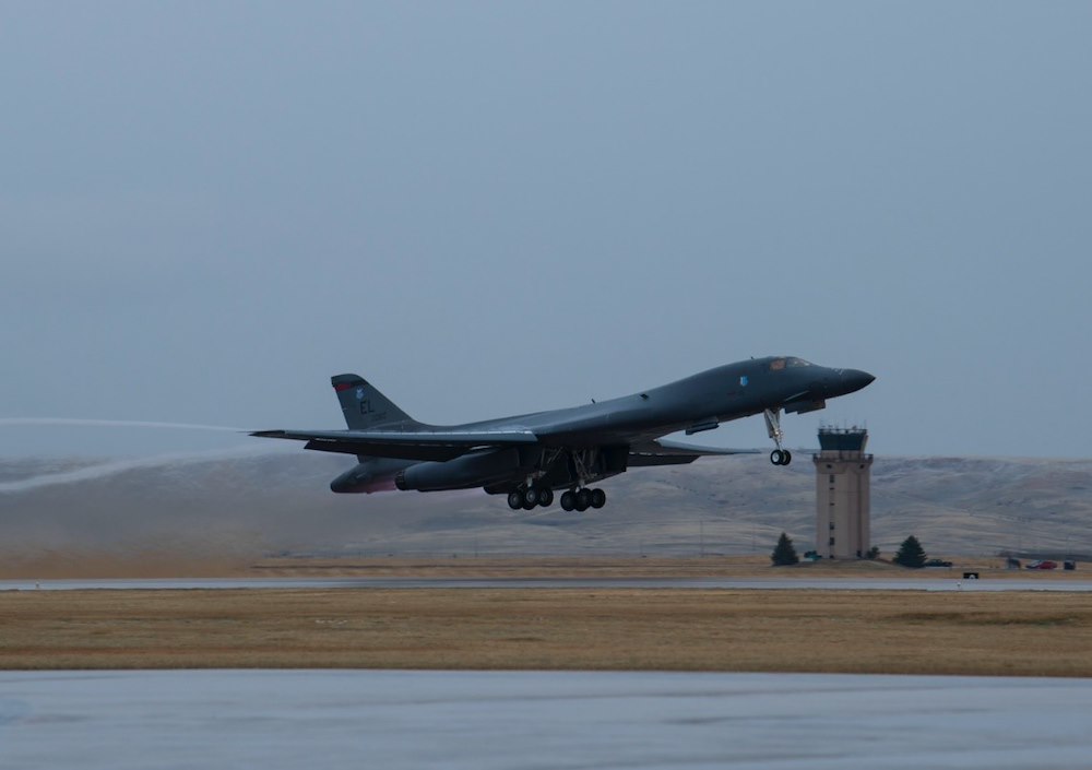 A B-1B Lancer takes off in support of a Bomber Task Force mission at Ellsworth Air Force Base, S.D., April 6, 2021. Bomber Task Force missions allow the U.S. to routinely and visibly demonstrate commitment to our Allies and partners through the global employment of our military.