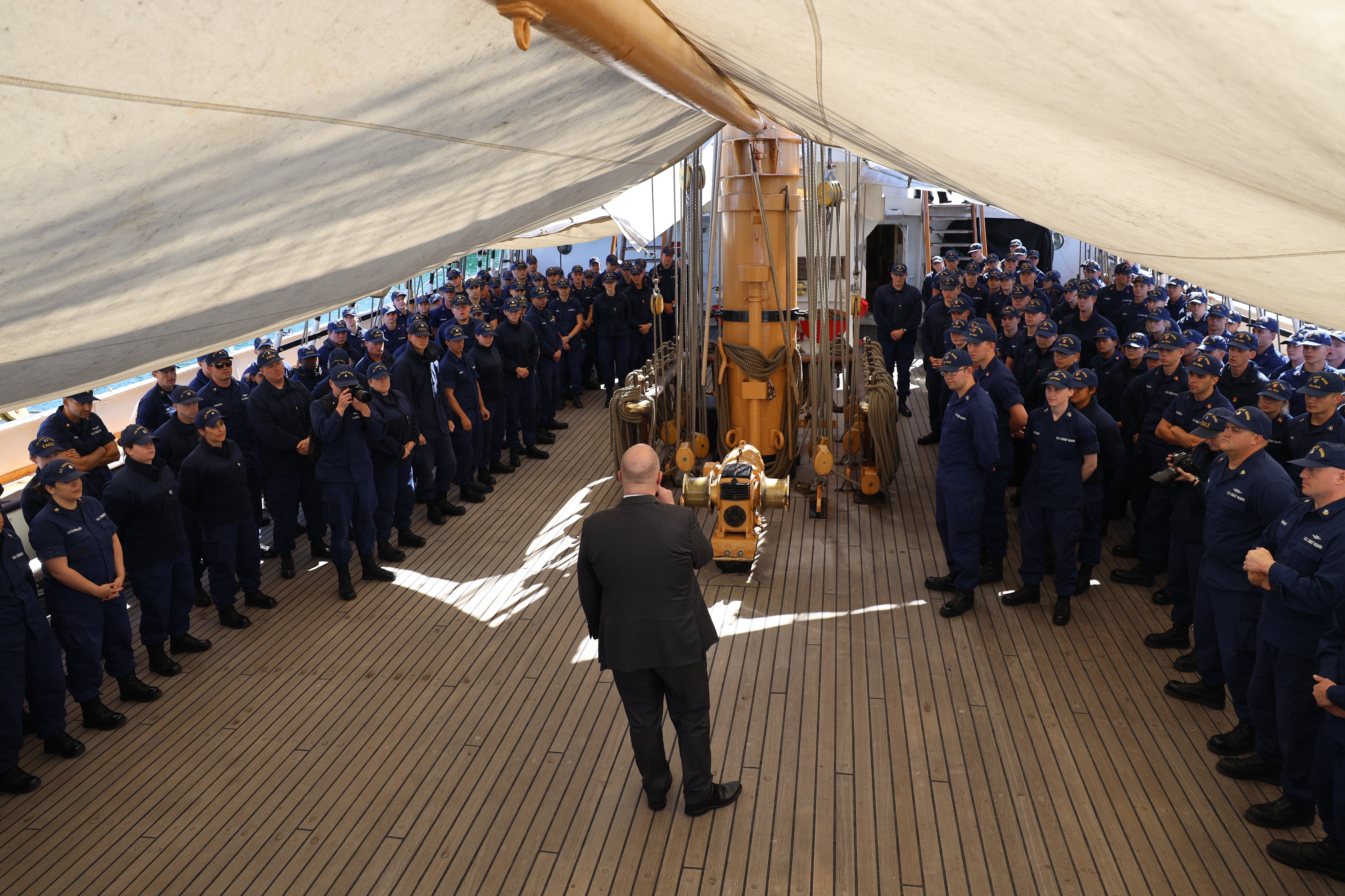 Jonathan Moore, principal deputy assistant secretary, Bureau of Oceans and International Environmental and Scientific Affairs, addresses the crew of USCGC Eagle (WIX 327), "America's Tall Ship," in Reykjavik, Iceland, June 12, 2021. Eagle is currently conducting summer U.S. Coast Guard Academy cadet training in at-sea leadership and professional development, first visiting Portugal, now Iceland, followed by Bermuda. (Photo courtesy U.S. Embassy Reykjavik, Kristjan Petersson)