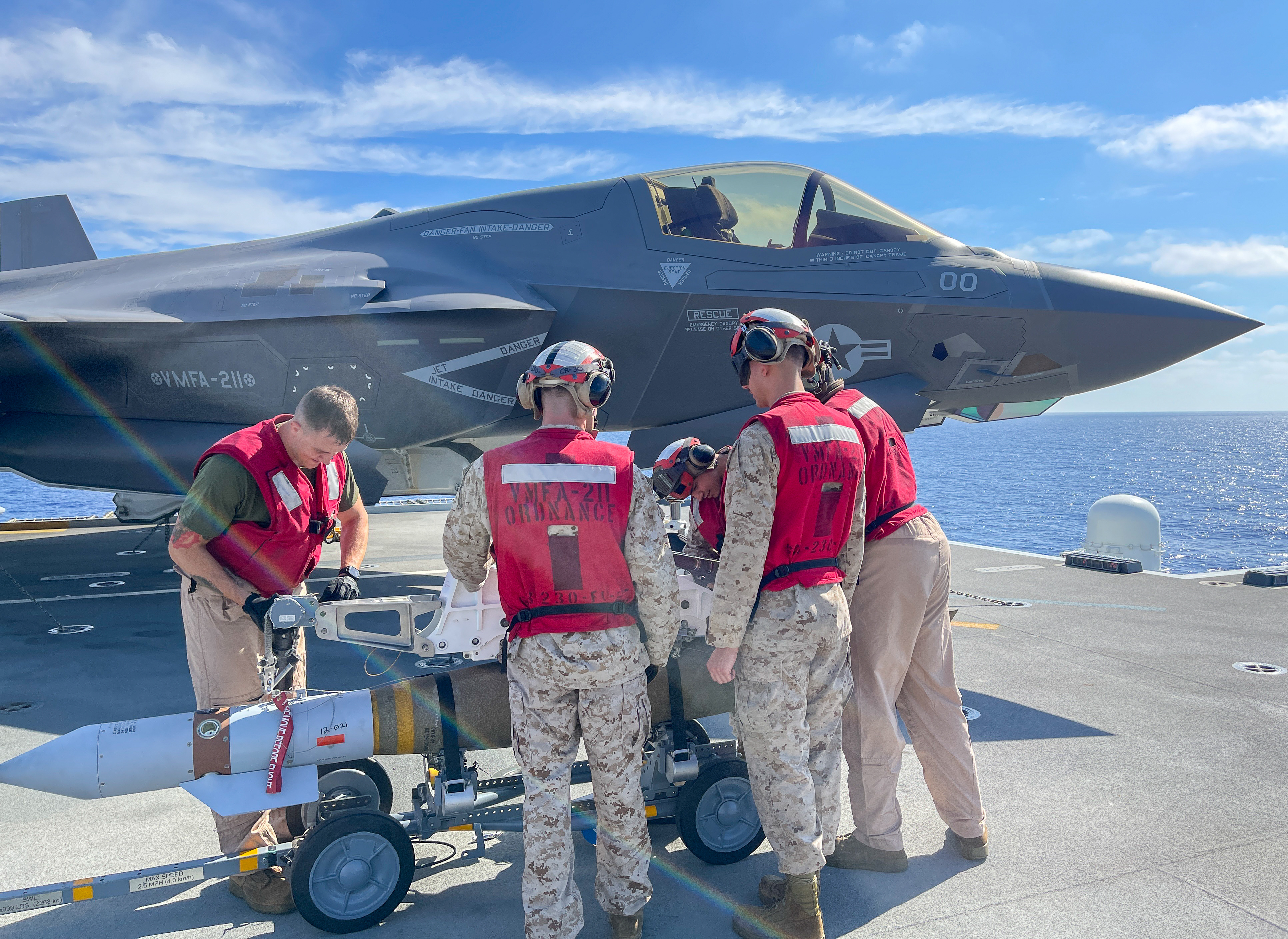 U.S. Marines with Marine Fighter Attack Squadron (VMFA) 211, Carrier Strike Group (CSG) 21, prepare to load a Guided Bomb Unit 12 into an F-35B Lightning II aboard HMS Queen Elizabeth in Sixth Fleet area of operations on June 18th, 2021. Alongside the United Kingdom’s 617 Squadron, VMFA-211 is conducting combat sorties in support of Operation Inherent Resolve (OIR), the first combat operations launched from HMS Queen Elizabeth. OIR is the operation to eliminate the ISIL terrorist group and the threat they pose to Iraq, Syria, and the wider international community.