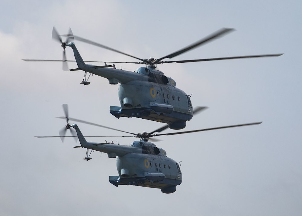 210630-N-BM428-0247 MYKOLAIV MILITARY AIRBASE, Ukraine (June 30, 2021) Two Ukrainian Mi-8 helicopters fly in formation during an air demonstration portion of Exercise Sea Breeze 2021 on Mykolaiv Military Airbase, Ukraine, June 30, 2021. Exercise Sea Breeze is a multinational maritime exercise cohosted by the U.S. Sixth Fleet and the Ukrainian Navy since 1997. Sea Breeze 2021 is designed to enhance interoperability of participating nations and strengthens maritime security and peace in the region. (U.S. Navy photo by Mass Communications Specialist 2nd Class Damon Grosvenor/Released)
