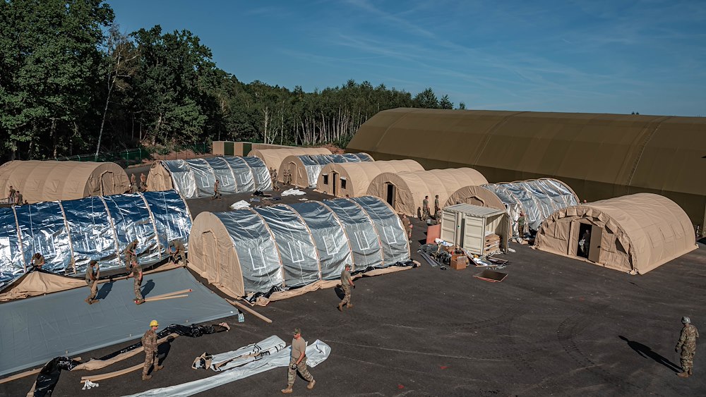 U.S. Air Force Airmen assigned to the 435th Construction Training Squadron assemble pods at Ramstein Air Base, Germany, Aug. 25, 2021. The 435th CTS, with the help of Dutch and Romanian military forces, are supporting Operation Allies Refuge by assembling pods for evacuees to stay in until they continue to other transient locations. (U.S. Air Force photo by Airman Jared Lovett)
