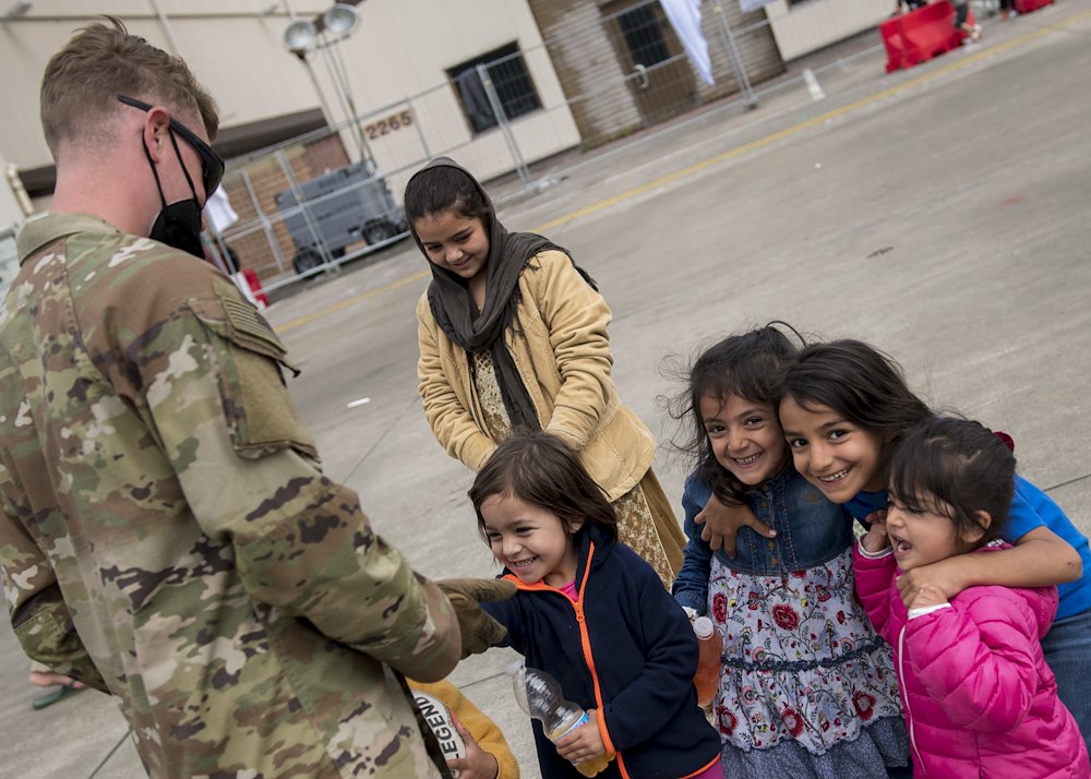 Cpl. Dylon Sitzler, a signal support systems specialist assigned to the 1st Battalion, 6th Field Artillery Regiment, 41st Field Artillery Brigade entertains children from Afghanistan during Operation Allies Refuge at Ramstein Air Base, Germany, Sept. 10, 2021. Ramstein Air Base is a transit center that provides a safe place for the evacuees to complete their paperwork while security and background checks are conducted before they continue on to their final destination. (U.S. Army photo by Staff Sgt. Thomas Mort)