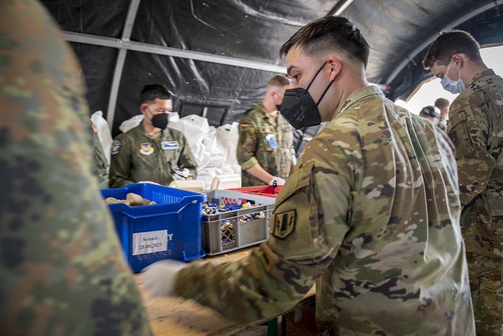 Service members from the U.S. Army and Air Force work shoulder to shoulder with soldiers from the German Bundeswehr to prepare meals for the Afghanistan evacuees. Ramstein Air Base is a transit center that provides a safe place for the evacuees to complete their paperwork while security and background checks are conducted before they continue on to their final destination. (U.S. Army photo by Staff Sgt. Thomas Mort)