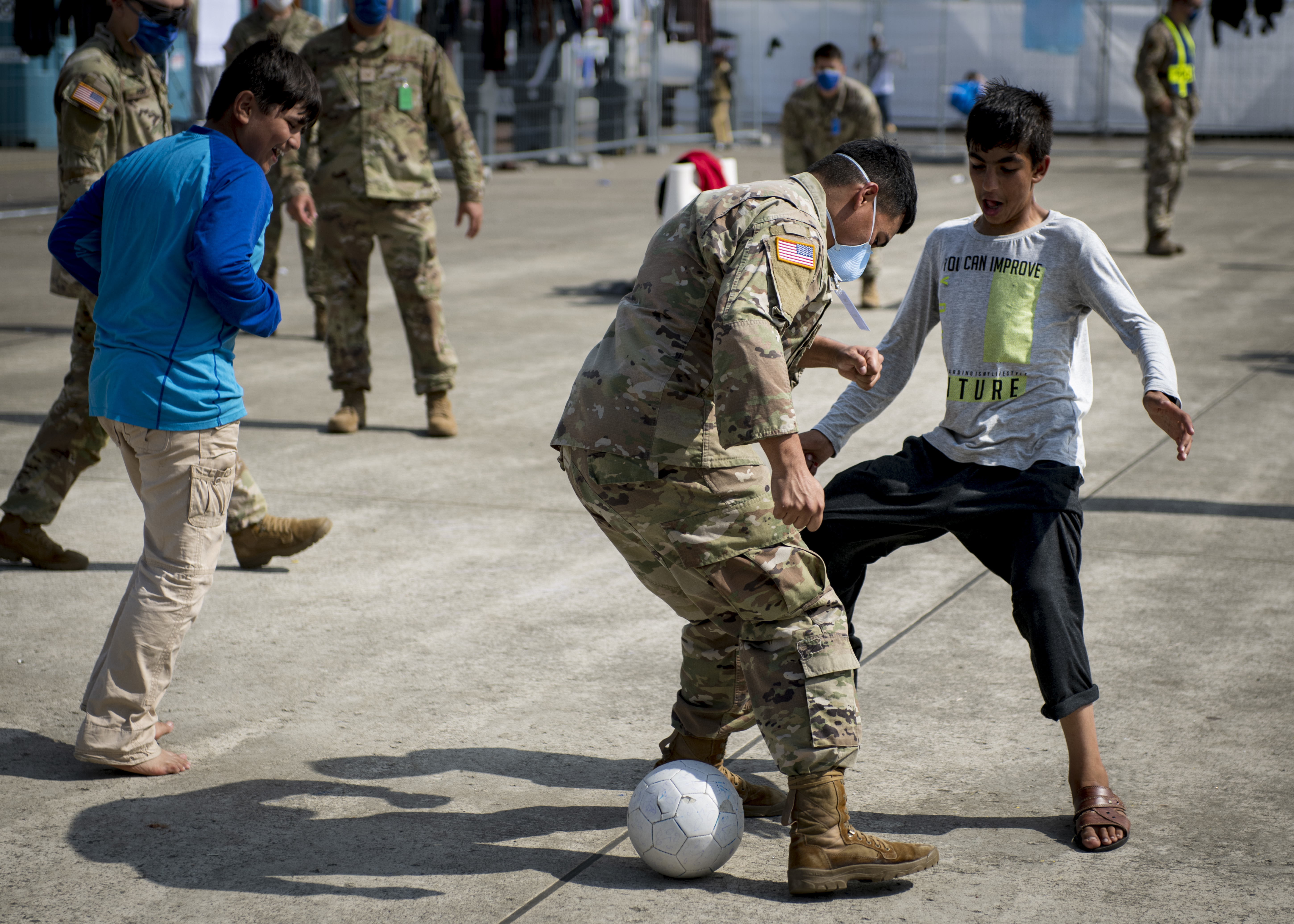 Soldiers assigned to the 1st Battalion, 6th Field Artillery Regiment, 41st Field Artillery Brigade play soccer with children from Afghanistan during Operation Allies Refuge at Ramstein Air Base, Germany, Sept. 10, 2021. Ramstein Air Base is a transit center that provides a safe place for the evacuees to complete their paperwork while security and background checks are conducted before they continue on to their final destination. (U.S. Army photo by Staff Sgt. Thomas Mort)