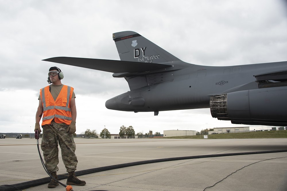 U.S. Air Force Staff Sgt. Alberto Silva assigned to the 9th Expeditionary Bomber Squadron refuels a B-1B Lancer aircraft employing the new Versatile Integrating Partner Equipment Refueling (VIPER) kit on Spangdahlem Air Base, Germany, Oct. 11, 2021. The VIPER kit system, an Agile Combat Employment capability, enables the bombers’ ability to land and operate from austere airfields at any forward staging location. (U.S. Air Force photo by Staff Sgt. Chance Nardone)